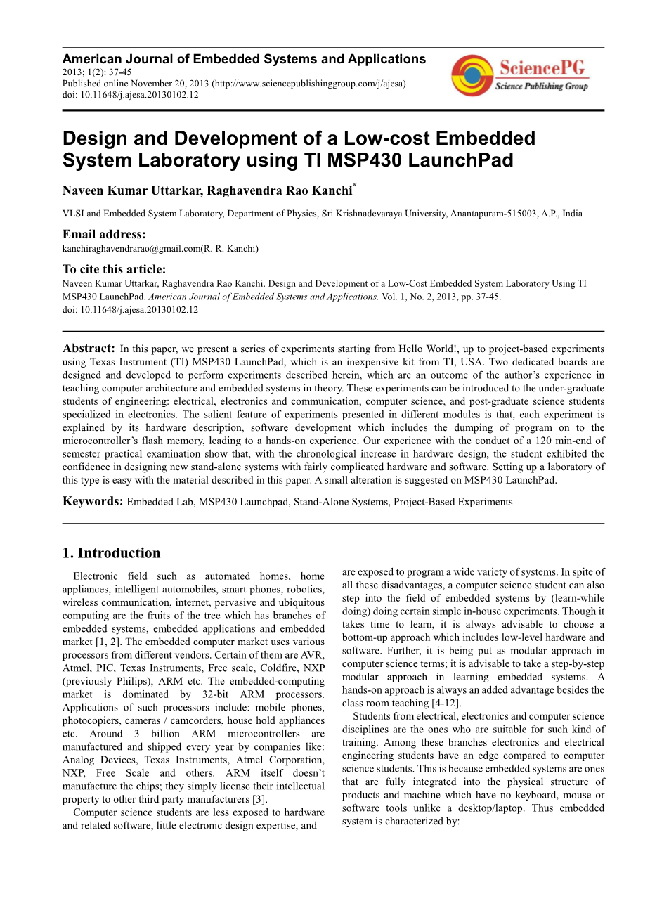 在本文中,我们将介绍一系列从Hello World!开始的实验,直到使用德克萨斯仪器公司(TI)MSP430 LaunchPad进行基于项目的实验,这是美国TI公司的廉价工具包。设计和开发两个专用板来执行本文所述的实验,这是作者在理论上教授计算机体系结构和嵌入式系统的经验的结果。这些实验可以介绍给工程学的研究生:电气,电子和通信,计算机科学和电子专业的研究生科学专业。在不同模块中提出的实验的突出特点是,每个实验都通过其硬件描述,包括将程序转储到微控制器的闪存中的软件开发来解释,从而导致实践体验。我们在进行120分钟的实习期末实践经验表明,随着硬件设计的逐年增加,学生展现了设计新硬件和软件相当复杂的独立系统的信心。通过分析可知建立这种类型的实验室很容易用本文描述的材料,并在 MSP430发射台上提出了一个小改动。