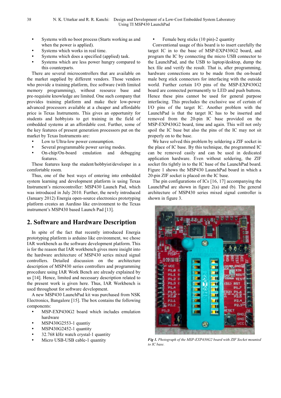 本文所设计和开发的所有实验分为三个模块:A,B和C.模块A描述了与MSP430G2553的I / O端口相关的软件和相关硬件连接(I / O板)。 有关片上外设编程的实验在模块B中介绍。项目相关实验,在我们的实验室中进行设计和开发,将在模块C中进行解释。在所有这些实验中,MSP430 LaunchPad板连接到笔记本电脑的USB端口并下载 将与开发的程序相关的十六进制文件存入MSP430G2553的闪存中。 然后将IC从ZIF插座上取下,放在目标板的ZIF插座上。 目标板采用3.3V / 5.0V直流电源供电