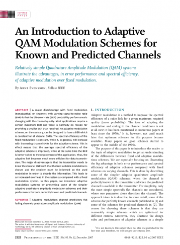 在信噪比(SNR)变化的信道上,固定调制(非自适应)的一个主要缺点是误码率(BER)概率性能随着信道质量的变化而变化。大多数应用程序都需要一 定的最大BER,通常没有理由提供比要求更小的BER。相反,自适应调制方案可以设计成对所有信道信噪比均为常数的误码率。固定调制的频谱效率是恒定的,而自适应调制的频谱效率一般会随着信道信噪比的增加而增加。这实际上意味着自适应方案的平均频谱效率得到了提高,同时误码率更适合应用的要求。因此,自适应链路对于数据传输变得更加有效。主要缺点是发射机需要知道信道信噪比,以便选择最合适的调制方式,并且必须告知接收机所使用的调制方式,以便解码信息,与固定调制系统相比,这导致系统开销增加。在本文中,我们介绍了自适应调制系统,通过介绍一 些简单的自适应正交调幅方案, 以及它们对已知信道和预测信道的性能。