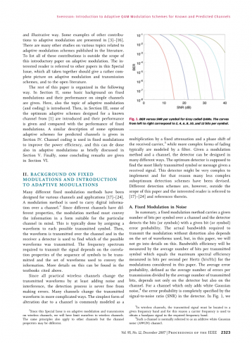 总而言之,固定调制方法在通道上为每个符号携带给定的比特数,检测器检测具有给定比特(或符号)错误概率的比特(或符号)。传输无失真调制所需的实际带宽也取决于所使用的波形集,但在本文中,我们不会对此进行详细讨论。带宽效率为由每次传输的平均位数测量符号,它等于最大光谱效率本文考虑的调制用比特/秒/赫兹(b/s/Hz)表示。平均误差概率,定义为平均每个错误的数量传输量除以平均传输量位,不仅取决于探测器,而且还取决于通道。对于只添加高斯白噪声的信道的误差概率完全由探测器信噪比(SNR)决定。