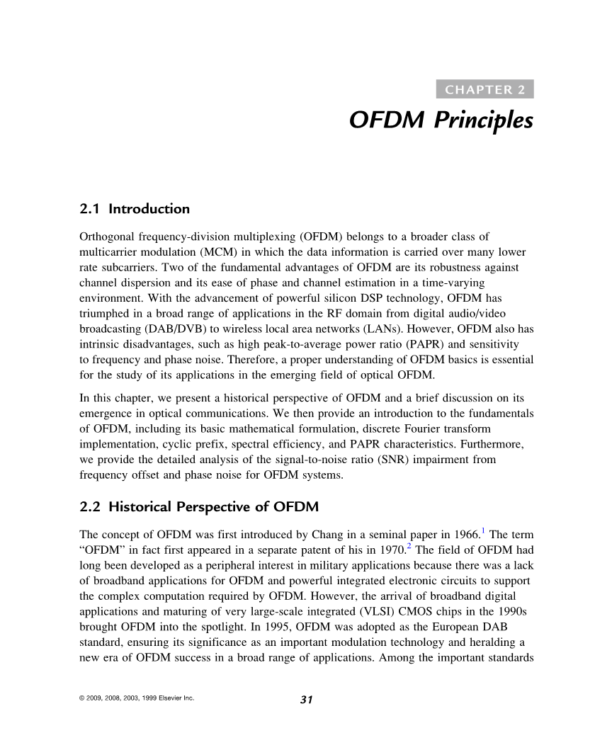 在本章中,我们给出了OFDM的历史背景,并简要讨论了OFDM在光通信中的出现。然后介绍了OFDM的基本原理,包括其基本数学公式、离散傅里叶变换实现、循环前缀、频谱效率和PAPR特性。此外,本文还详细分析了OFDM系统中频偏和相位噪声对信噪比的影响。