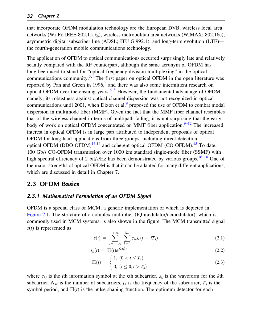 OFDM技术在光通信中的应用相对于射频通信而言,性能惊人的低,尽管OFDM的相同缩写长期以来一直用于代表光通信界的“光频分复用”。本文首次报道了在开放文献中的光学OFDM技术,由Pan和Green在1996年的论文中报道。此外,在接下来的几年里,也有一些关于光OFDM的间歇性研究。然而,直到2001,当dixon等人,提出OFDM的基本优势,即对光信道色散的鲁棒性并不能被识别到光通信中,提出了OFDM技术用于多模光纤(MMF)中的模态色散效应。鉴于MMF光纤通道与无线信道相比,在多径衰落方面,光OFDM的早期工作集中于MMF光纤应用方面,并不奇怪。学界对光学OFDM的兴趣越来越大,主要归因于光学OFDM技术在远程应用中的独立建议,包括直接探测光OFDM(DDO)。以及相干光OFDM(Ofdm)。迄今为止,已有100 gb/s的CO传输1000 km标准单模光纤(SSMF),具有2位/s/hz的高频谱效率。光OFDM技术的主要优点之一就是它可以适应许多不同的应用,而在第七章中,这些应用则在以下几个方面进行了详细的讨论。