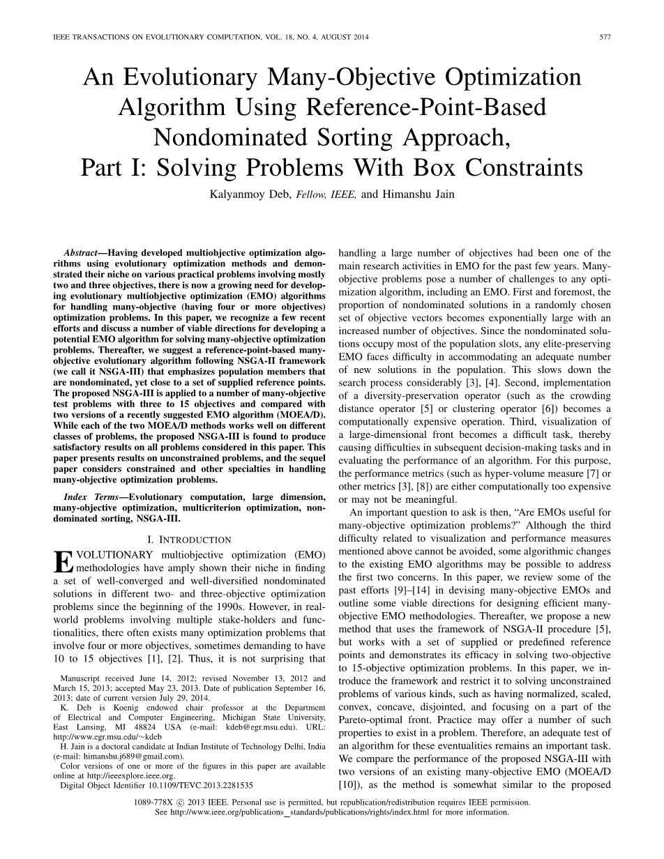 本文所提出的多目标的基本框架NSGA-II(或NSGA-III)与最初的NSGA-II算法[5]一样,在选择算子中进行了显著改进。但是,不同于NSGA-II的是,NSGA-III中的种群成员多样性是通过提供和适用性地更新大量传播良好的参考点来保持的。为了本文的完整性,我们首先要简略地介绍一下最初的NSGA-II算法。