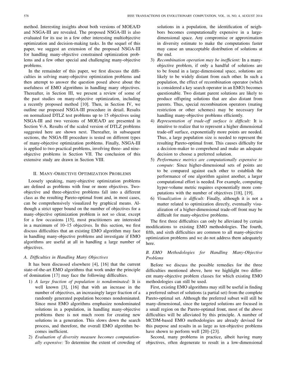 Garza-Fabre等人[16]研究了两个竞争的父代个体之间的差异,并基于这一差异提出了三种单目标优化的方法,这项研究表明,与常规的Pareto支配EMO方法相比,该方法在五目标到50目标之间的DTLZ1,DTLZ3和DTLZ6问题收敛性更强。 Purshouse和Fleming [39]的研究表明,在Pareto最优前沿附近,多样性和收敛性是两个不可兼得的目标,特别是对于许多多目标优化问题,一般的遗传算子根本不足以同时实现两个目标。另一项研究[40]又在NSGA-II算法中添加了分集控制算子,以此来解决6到20目标优化的DTLZ2问题。 Koppen和Yoshida [41]声称NSGA-II过程的独创性并不适用于多目标优化问题,并提出了许多可以取代NSGA-II拥挤距离算子以获得更好性能的指标。基于双目标到15目标DTLZ2,DTLZ3和DTLZ6问题的仿真研究,他们提出以替代指配距离度量作为最佳策略。 Hadka和Reed [42]提出了一种基于集合的EMO程序,该程序从8到10个不同的预定义算子中选择出来一个合适的重组算子(这些算子即问题中各代群体的成功率)。它还涉及了E-支配性的概念以及一种自适应的种群规模调整方法,据称可以成功解决八目标优化问题。Bader和Zitzler [43]提出了一种计算基于样本的超容量的快速程序,并设计了一种算法来找到一组使得超容量最大化的解决方案。越来越多的关于近似超容量计算的文献[18],[44],[45]使得这种方法在解决多目标问题时实用化。
