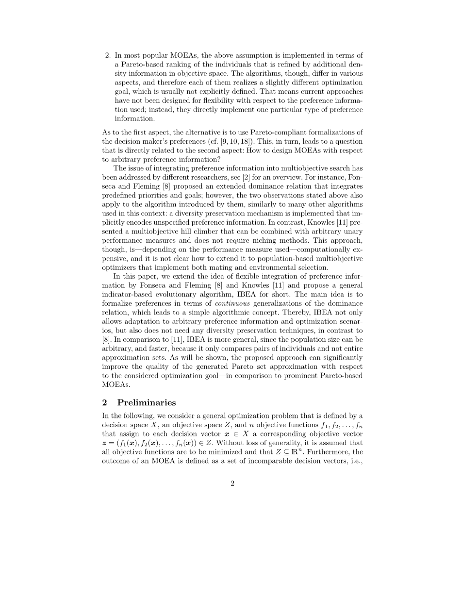 1.大多数MOEAs的基础是假设存在两个相互冲突的目标:(i)最小化到Pareto最优集合的距离,以及(ii)在Pareto最优集合的近似范围内最大化多样性[3]。然而,最近的研究[10,18]表明,这种假设是有问题的;根据我们的最佳知识,对于两个单独的目标,这里没有一个正式的定义,一个用于收敛,一个用于多样性,那是符合Pareto支配关系的。此外,还有与[1]中讨论的这个问题有关的实际问题。