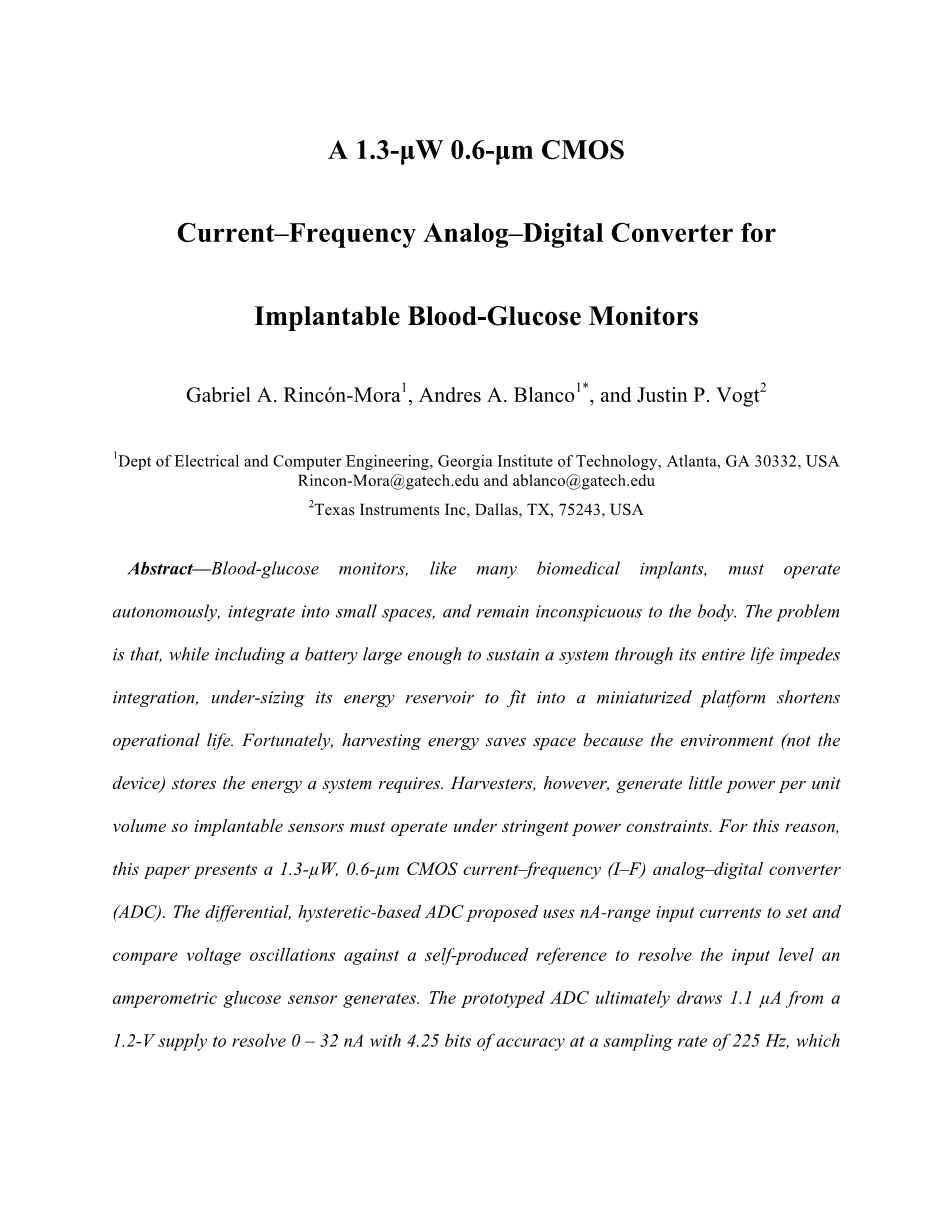 摘要:血糖监测仪,如许多生物医学植入物,必须自主操作,集成到小空间,并对身体保持不显眼。问题是,虽然包括足够大的电池以在整个寿命中维持系统阻碍了集成,但是其能量储存器尺寸不足以适应小型化平台缩短了操作寿命。幸运的是,收获能量节省了空间,因为环境(而不是设备)存储系统所需的能量。然而,收割机每单位体积产生的功率很小,因此可植入传感器必须在严格的功率约束下操作。因此,本文提出了一个1.3-mu;W,0.6-mu;mCMOS电 流-频率(I-F)模数转换器(ADC)。提出的基于差分,基于滞后的ADC使用nA范围输入电流来设置和比较电压振荡和自产生参考,以分辨电流型葡萄糖传感器产生的输入电平。原型ADC最终从1.2 V电源抽取1.1mu;A,以225 Hz的采样速率以4.25位精度解决0 - 32 nA,这种相对简单且易于理解的电路和布局修改可将精度提高到5位。