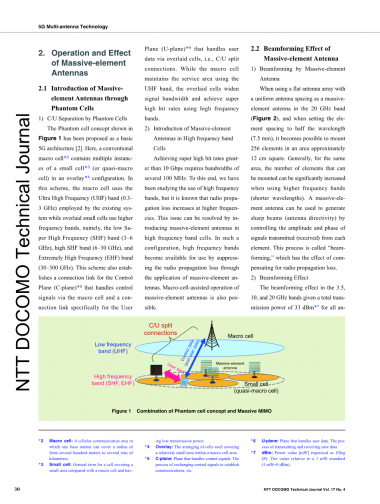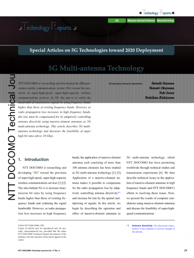 NTT DOCOMO正在研究和开发针对超高速,超高容量无线通信服务提供的“5G”。5G背后的想法是通过使用高于现有频带的频率频带和扩大信号带宽来增加传输任务比特率。然而,随着无线电传播损耗在高频率下增加,作为5G多天线技术,由100多个天线单元组成的大规模天线的应用已经在研究中。大规模元件天线的应用使得可以通过自适应地控制天线方向性来补偿无线电传播损耗,并通过信号的空间复用来增加比特率。在本文中,我们首先描述大块天线的操作和效果, NTT DOCOMO通过技术研究和传输实验在全球范围内推广该大块天线。然后,我们描述了在高频段应用大规模元件天线的技术问题以及NTT DOCOMO在解决这些问题方面所做的努力。接下来,我们介绍使用大规模天线的计算机模拟结果,并讨论超高速通信的可行性。