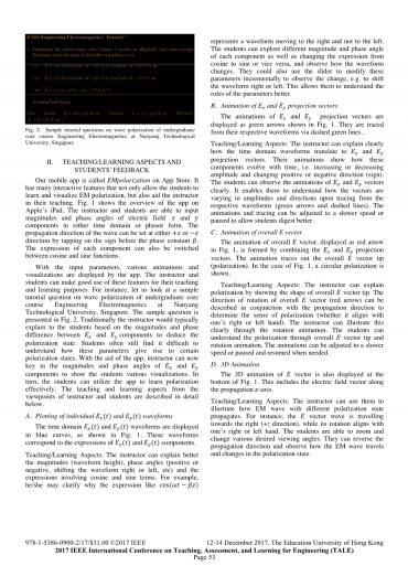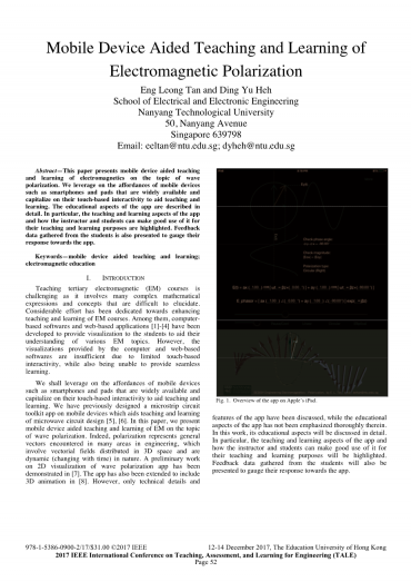 我们将利用广泛使用的智能手机和平板电脑等移动设备的可靠性,并利用其基于触摸的交互性来辅助教学和学习。我们之前在移动设备上设计了一个微带电路工具包应用程序,它有助于微波电路设计的教学和学习,本文中,我们介绍了移动设备辅助教学和学习EM波导极化的主题,实际上,极化表示在工程中的许多领域中遇到的一般矢量,其涉及在3D空间中分布的矢量场并且在自然界中是动态的(随时间变化)。关于波偏振应用的2D可视化的初步工作已经在,该应用程序也已扩展到包括3D动画。但是,仅讨论了应用程序的技术细节和功能,而应用程序的教育方面尚未在其中进行彻底强调,在这项工作中将详细讨论其教育方面。特别是,应用程序的教学和学习以及教师和学生如何充分利用它来实现教学和学习目的,此外还将呈现从学生处收集的反馈数据,以评估他们对应用程序的响应。