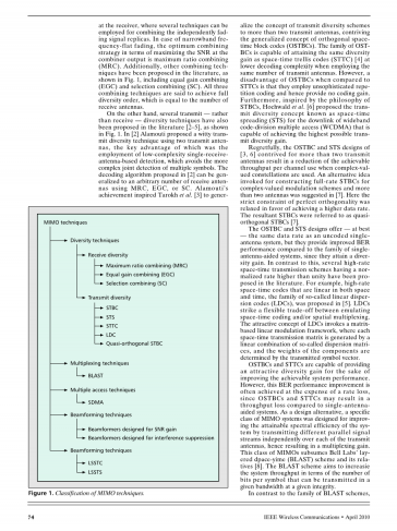 受到文献[10,12,13]中的性能改进的启发,El-Hajjar等人在文献[14]中提出了一种三重功能MIMO方案,其将分集增益与复用增益和波束成形增益相结合。文献[14]的MIMO方案被称为分层导引空时码(LSSTC),其中并行数据流由OSTBC层编码,并且每个层可能具有不同的OSTBC结构 另外,LSSTC方案的解码器采用排序策略来解码不同的层,以便改善可实现的性能。