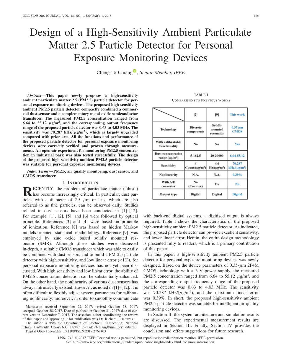 最近颗粒物质(“粉尘”)的问题变得越来越重要。特别是直径为0.1mm的尘埃颗粒2.5微米或更少,这些也被称为细颗粒,可以每天观察。已经进行了有关灰尘传感器的研究。例如,[1],[2],[5]和[6]之后是光学原理。参考文献[3]和[4]基于电离原理。参考文献[8]基于隐马尔科夫模型导向的统计方法。氧化锌基固体谐振器(SMR)采用参考文献[9]。虽然对这些研究进行了深入的讨论,但是一种合适的CMOS传感器可以很容易地与尘埃传感器结合,并且可以构建高灵敏度,低线性误差(lt;1%)的PM 2.5粒子探测器,用于个人暴露监测设备尚未讨论。具有高灵敏度和低线性误差,可大大提高PM2.5浓度检测能力。另一方面,各种灰尘传感器的非线性始终存在。然而,如[1] - [2][3] [4][5][6][7][8][9][10][11][12]所述,通常难以灵活调整用于校准非线性的系统参数;此外,为了顺畅地与后端数字系统进行通信,总是需要数字化输出。如所指出的,所提出的粒子检测器可以提供优异的灵敏度和较低的线性误差。在这里,整个设计方法将全面呈现给读者,这是本文的主要贡献。