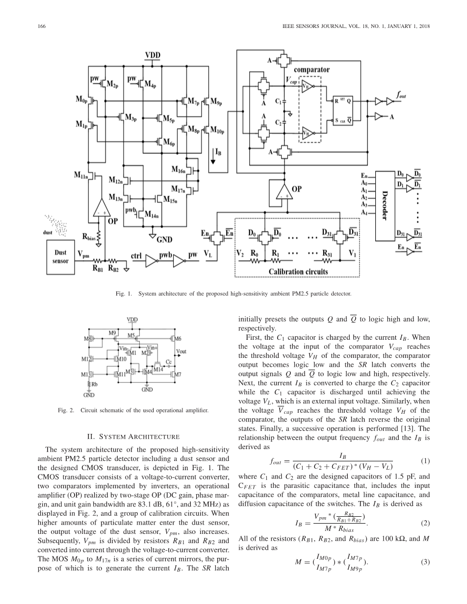 所提出的包括一个灰尘传感器和设计的CMOS传感器的高灵敏度环境PM2.5粒子检测器的系统架构如图1所示.CMOS传感器由一个电压 - 电流转换器,两个比较器,如图2所示的由两级OP(DC增益,相位裕量和单位增益带宽为83.1 dB,61°和32 MHz)实现的运算放大器(OP)和一组校准电路。当更多的颗粒物质进入灰尘传感器时,灰尘传感器的输出电压在5V以下,后来被电阻器RB1和RB2分开并通过电压 -电流转换器转换成电流。 MOS中号0P至中号17N是一系列电流镜,其目的是产生电流一世乙。 SR锁存器最初预设输出Q和Q分别到逻辑高和低。