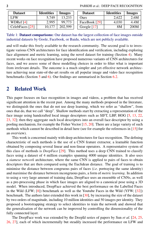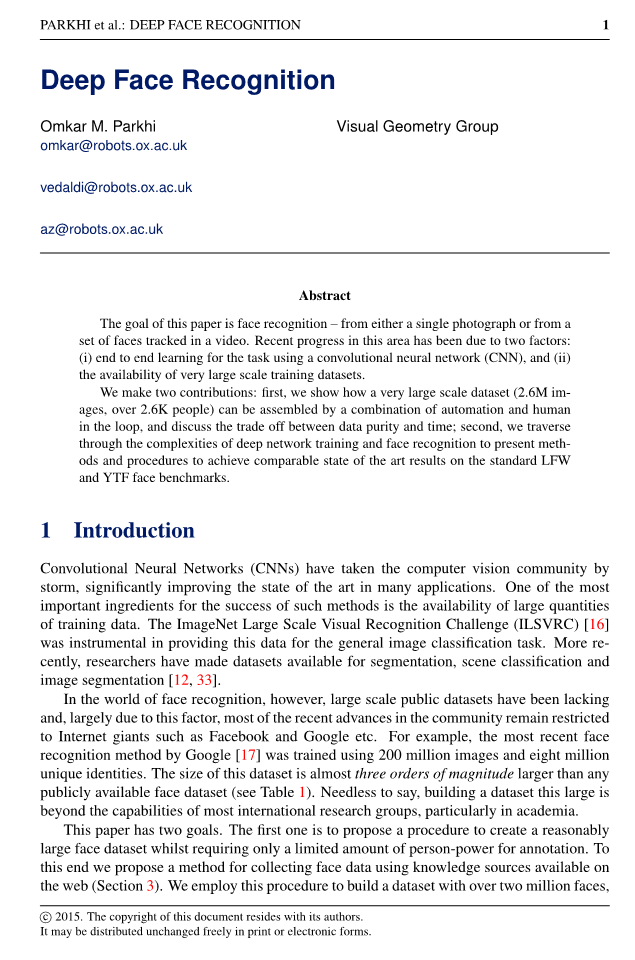 我们做出了两项贡献:首先,我们展示了如何通过循环中的自动和人工组合来获取大规模数据集(2.6万张图像,超过2600人),并讨论了在数据纯度与时间之间的折衷办法;其次,我们通过深度网络的训练和人脸识别的复杂性来展示我们的方法和程序,其在标准LFW和YTF人脸基准上实现的效果可与目前最优结果相媲美。