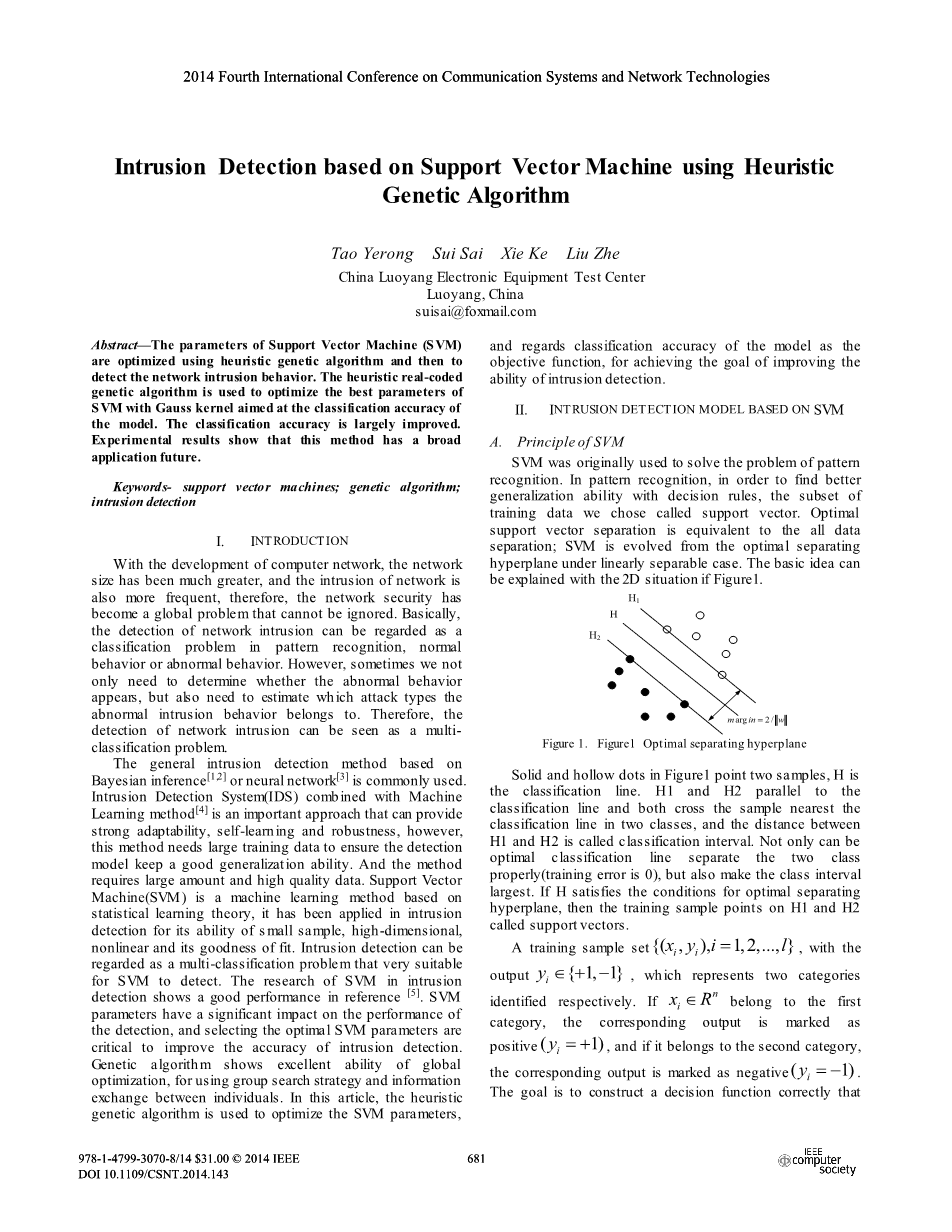 常用的基于贝叶斯推理[1,2]或神经网络[3]的入侵检测方法是常用的。入侵检测系统(IDS)结合机器学习方法[4]是一种重要的方法,它具有较强的适应性、自学习性和鲁棒性,但该方法需要大量的训练数据,以保证检测模型具有良好的泛化能力。该方法需要大量和高质量的数据。支持向量机(SVM)是一种基于统计学习理论的机器学习方法,它具有S样条、高维、非线性和拟合度等优点,在入侵检测中得到了广泛的应用。入侵检测可以被看作是一个多分类问题,非常适合SVM检测。支持向量机在入侵检测方面的研究显示了良好的性能[5]。SVM参数对检测性能有重要影响,选择最优的SVM参数对提高入侵检测的准确性至关重要。遗传算法具有良好的全局寻优能力,适用于群体搜索策略和个体之间的信息交换。本文采用启发式遗传算法对支持向量机参数进行优化,以模型的分类精度为目标函数,达到提高入侵检测能力的目的。