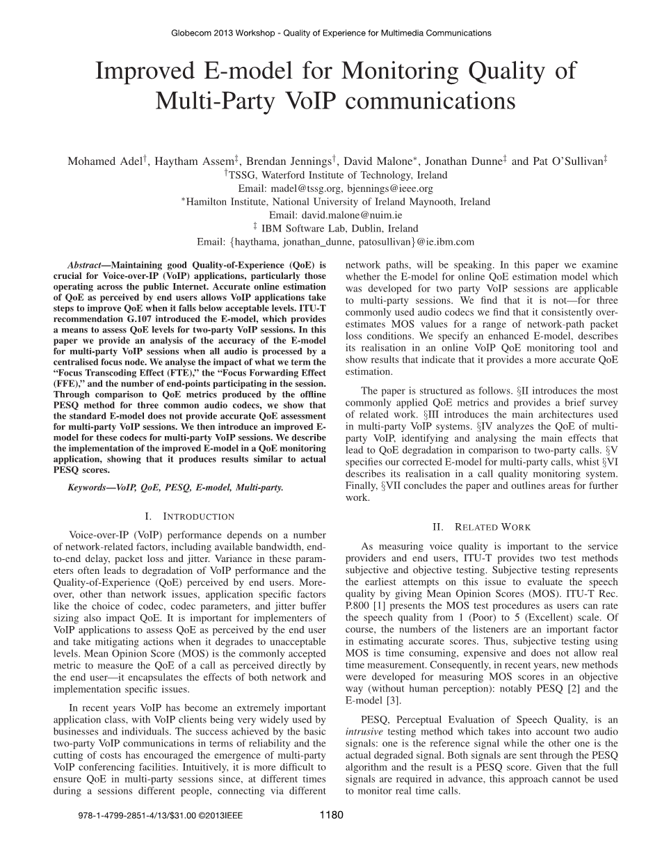 为了研究原始E-模型在评估多方音频呼叫的QoE方面的准确性,我们在我们的监测系统中采用了原来的E-模型