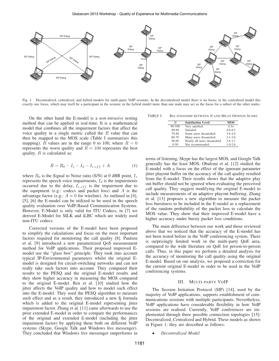 本文结构如下。 sect;II介绍了最常用的QoE度量标准,并提供了相关工作的简要调查。 sect;III介绍了用于多方VoIP系统的主要架构。 sect;IV分析多方VoIP的QoE,识别和分析导致QoE退化的主要影响与两方通话相比。 sect;V指定了我们修正的多方通话的E-模型,惠斯特sect;VI描述了它在通话质量监测系统中的实现。最后,sect;VII总结了本文并概述了进一步工作的领域。