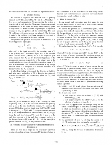 我们提出了一个新的合作框架,在这个框架中,二级用户可以决定是参与频谱感知,还是不做任何事情来节省自己的能量。这个框架被建模为一个不断变化的过程[7],[8],它提供了一个很好的方法来解决用户/用户在探索不同行为时可能面临的策略不确定性。对于那些什么都不做的SUs,我们将他们视为可以窃听有关主要用户状态的最终决定的免费用户。通过做出不同的选择,SUs可以获得不同的公共频谱资源,这取决于其实现的收入/吞吐量和资源消耗。每个SU根据其效用历史选择其操作,如果策略带来更高的效用,理性用户应该更频繁地选择该策略。