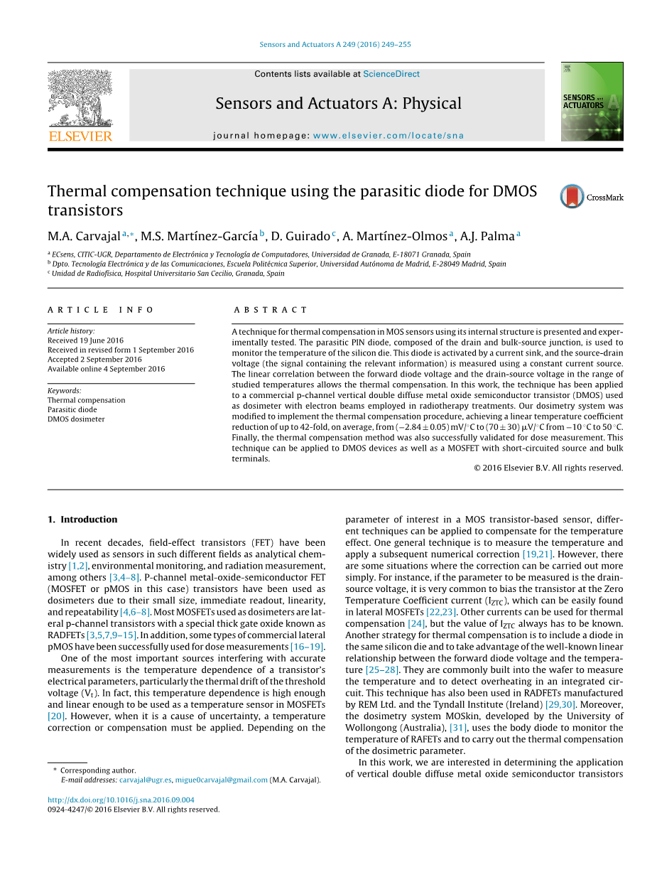 摘要—— 一种使用MOS传感器内部结构的的热补偿技术被提出并进行实验测试。由漏极和体-源结构成的寄生PIN二极管用于监测硅管裸片的温度。该二极管由电流吸收器激活,并且使用恒流源来测量源极 - 漏极电压(包含相关信息的信号)。在所研究的温度范围内,正向二极管电压和漏源电压之间的线性相关性允许热补偿。本论文中,将此技术应用于商用p沟道垂直双扩散金属氧化物半导体晶体管(DMOS),其用作放射治疗中使用的具有电子束的剂量计。修改我们的剂量测定系统,以实现热补偿程序,实现在-10℃到50℃变化范围内,线性温度系数平均从(-2.84plusmn;0.05)mV /◦C到(70plusmn;30)V/◦C,降低高达42倍。最后,热补偿方法也成功验证了剂量测量。该技术可以应用于DMOS器件以及具有源极短路和体端子的MOSFET。