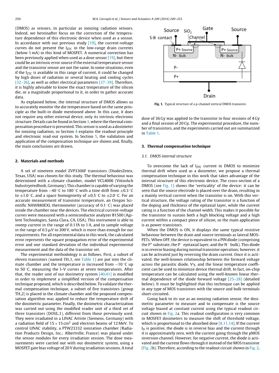 在这项工作中,我们感兴趣的是确定垂直双扩散金属氧化物半导体晶体管(DMOS)作为传感器,特别是作为电离辐射传感器的应用。下文中,我们在下文中集中于用作传感器时该电子器件的温度依赖性的校正。根据我们以前的研究[19],电流 - 电压曲线在这种MOSFET中不呈现IZTC在低范围漏极电流(低于1 mA)。当用作剂量传感器时,以前已经应用了数值校正[19],但是如果外部温度传感器和晶体管传感器不相同,则可能存在固有误差源。在一些情况下,即使IZTC在这个电流范围内可用,也可以通过高剂量的辐射或几个加热和冷却循环[32-36]以及其他电参数[37-39]来改变。因此,非常可取的是知道硅化物的精确温度或与其成比例的幅度,以便收集准确的数据。