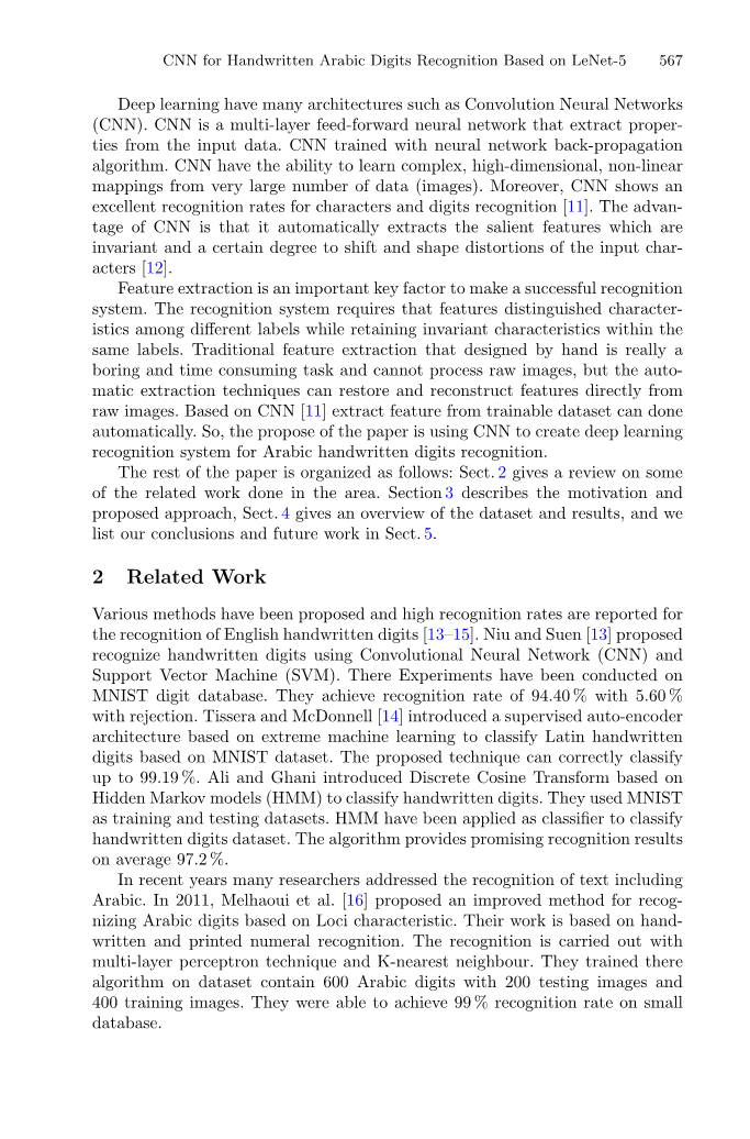 近年来,许多研究人员讨论了包括阿拉伯文在内的文本识别。2011年,Melhaoui等人[16]提出了一种改进的基于Loci特征的阿拉伯数字识别方法。他们的工作基于手写和打印的数字识别。识别是用多层感知器技术和K近邻进行的。他们在那里训练数据集的算法,包含600个阿拉伯数字,200个测试图像和400个训练图像。他们能够在小型数据库上实现99%的识别率。