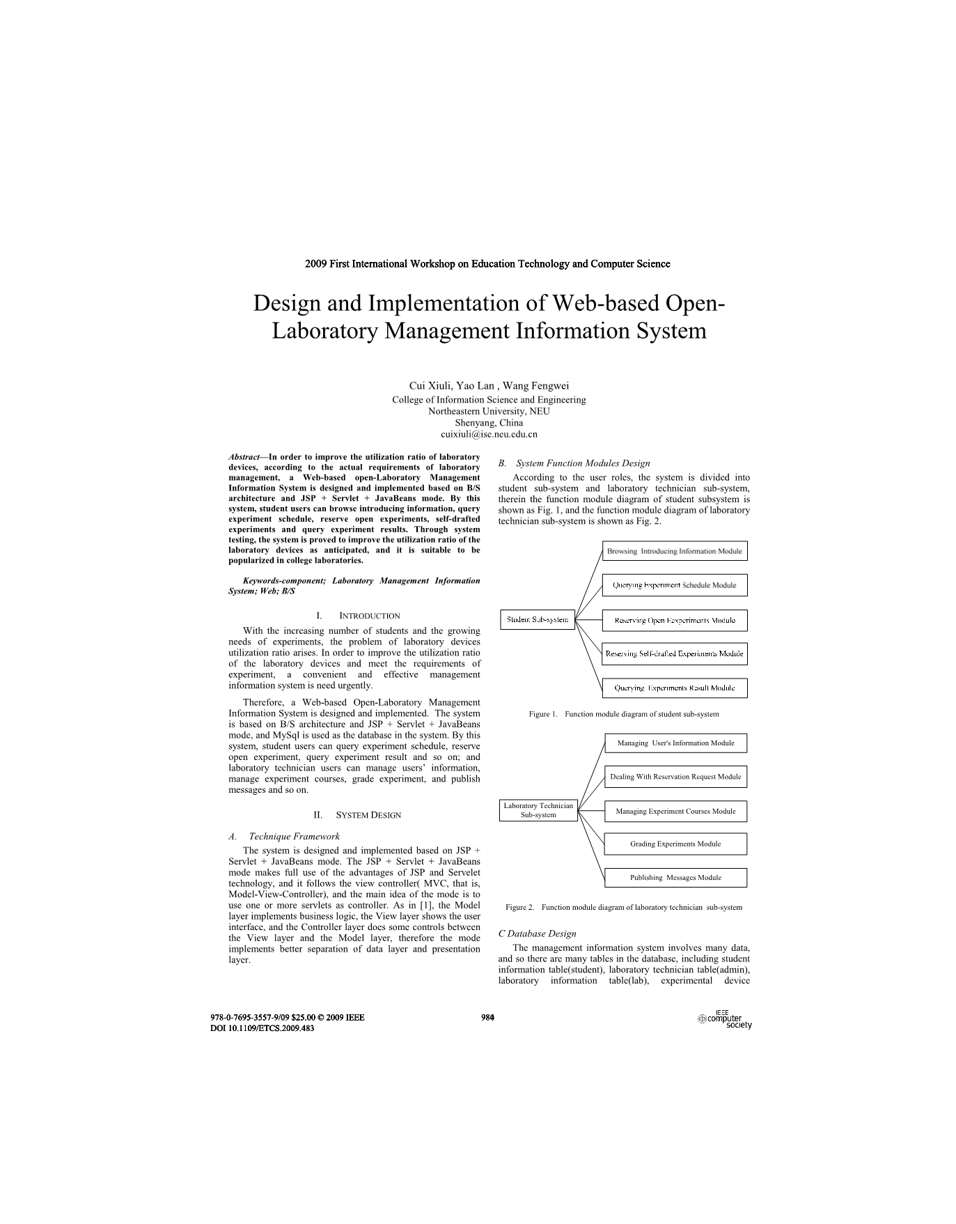 为提高实验室设备的利用率,根据实验室管理的实际要求,基于B / S体系结构和JSP Servlet JavaBeans模式设计并实现了基于Web的开放式实验室管理信息系统。通过该系统,学生用户可以浏览介绍信息,查询实验时间表,保留开放实验,自行起草实验和查询实验结果。通过系统测试,证明该系统可以像预期的那样提高实验室设备的利用率,适合在大学实验室推广使用。
