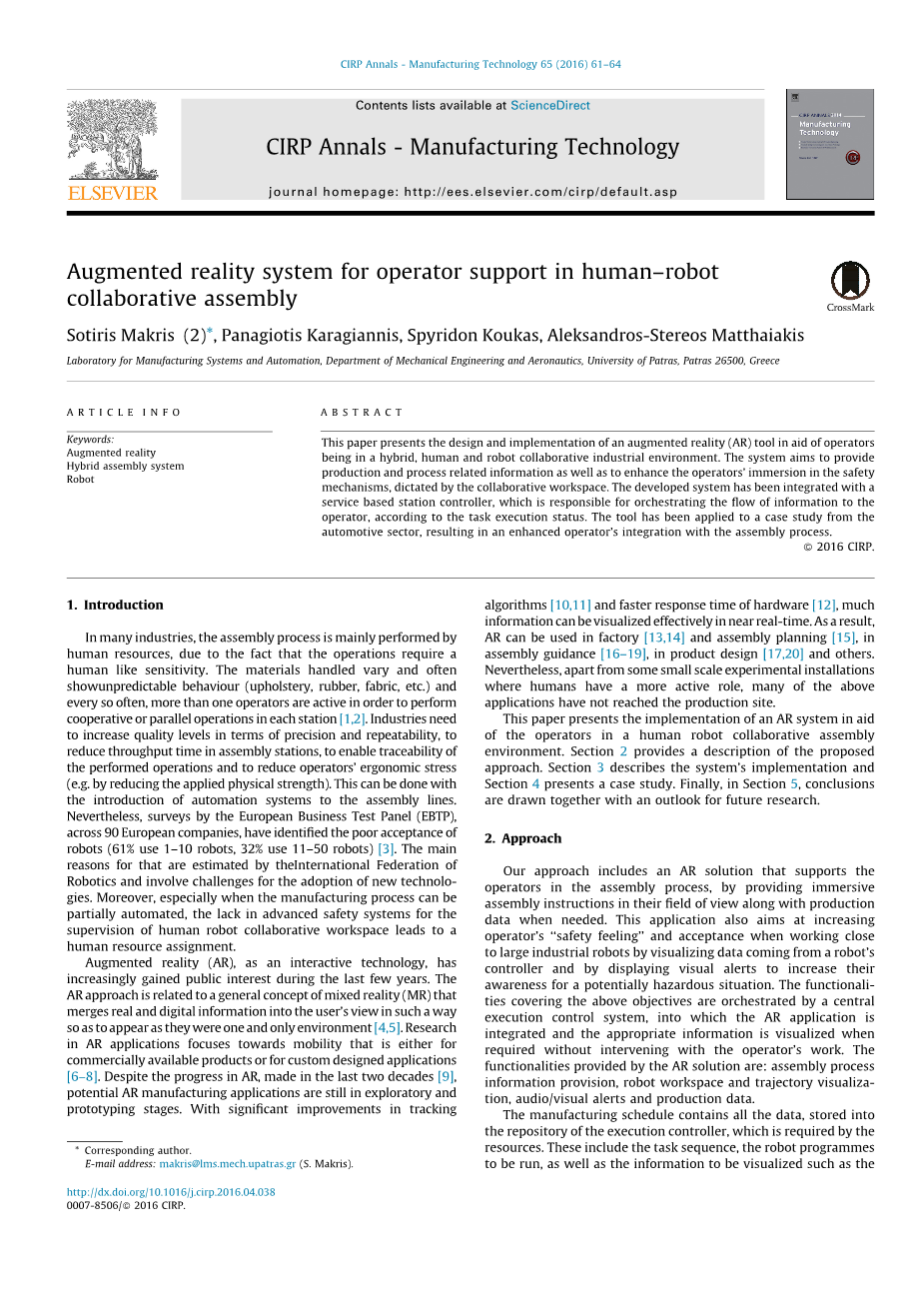 [2] Michalos G, Makris S, Papakostas N, Mourtzis D, Chryssolouris G (2010)Automotive Assembly Technologies Review: Challenges and Outlook for a Flexible and Adaptive Approach. CIRP Journal of Manufacturing Science and Technology 2(2):81–91.