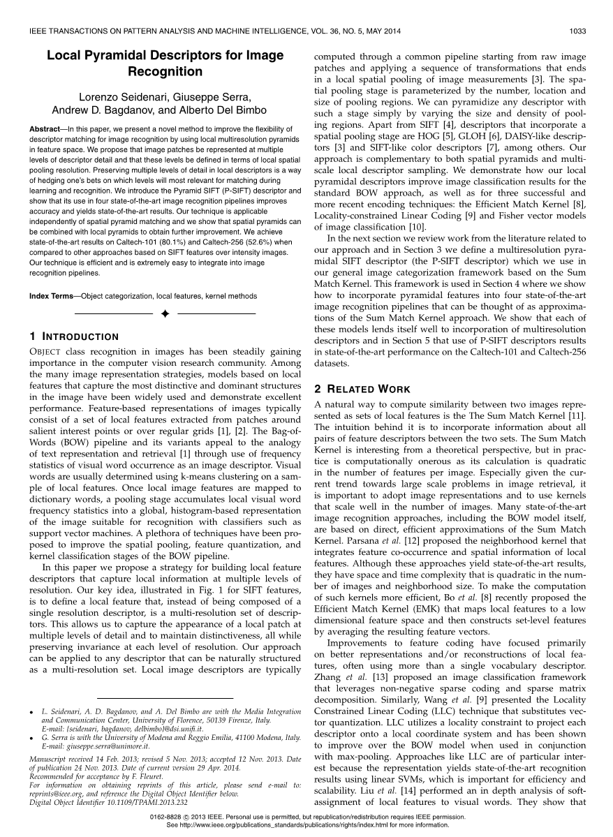 本文介绍金字塔SIFT(P-SIFT)描述符,并显示其在四个最先进的图像识别管道中的使用可提高准确性并获得最新的结果。本文的技术可独立于空间金字塔匹配应用,并且本文将显示空间金字塔可以与当地金字塔结合以获得进一步改进。