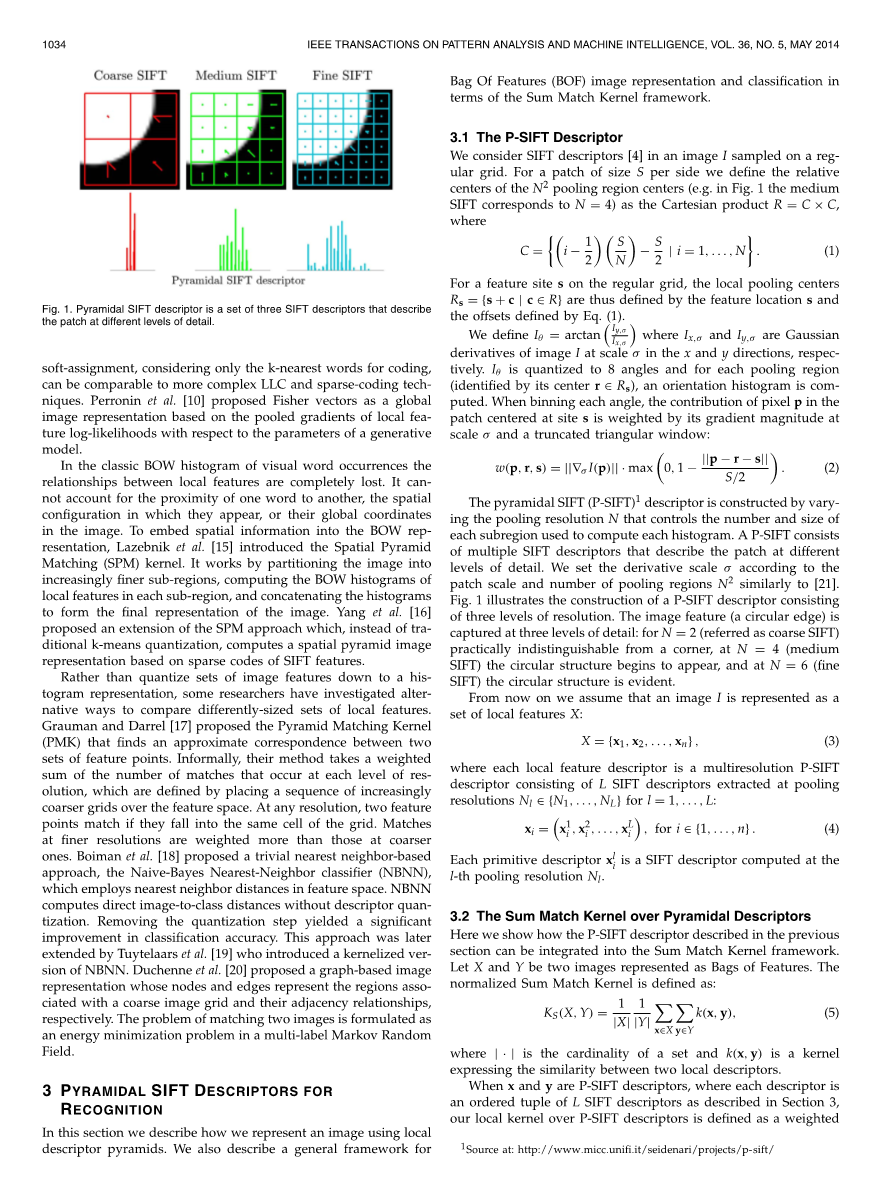 当x和y是P-SIFT描述符时,其中每个描述符都是第3节中描述的L个SIFT描述符的有序元组,我们的P-SIFT描述符上的本地核被定义为局部金字塔每个级别描述符相似度的加权: