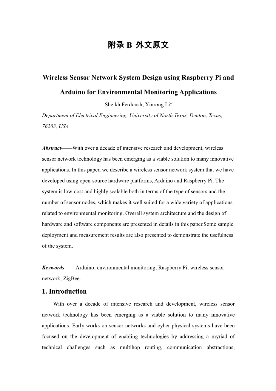 建筑内环境信息采集与显示系统的设计与实现外文翻译资料 2022-03-31 20:53:04 英语原文共 13 页,剩余内容已隐藏,支付完成后下载完整资料 英语译文共 9 页,剩余内容已隐藏,支付完成后下载完整资料资料编号:[468432],资料为PDF文档或Word文档,PDF文档可免费转换为Word 原文和译文剩余内容已隐藏,您需要先支付 30元 才能查看原文和译文全部内容!立即支付 发小红书推广免费获取该资料资格。点击链接进入获取推广文案即可: Ai一键组稿 | 降AI率 | 降重复率 | 论文一键排版 PREVIOUS NEXT 您可能感兴趣的文章 看边界:边界感知面部对齐算外文翻译资料 看边界:边界感知面部对齐算外文翻译资料 一种支持分布式正态智能监控的多代理体系结构外文翻译资料 增强的无线局域网协作MAC外文翻译资料 近眼显示器的绝对辐射和光度测量外文翻译资料 红外遥控系统外文翻译资料 一幅单一图像中雨滴去除的专注生成对抗性网络外文翻译资料 深度残差学习在图像识别中的应用外文翻译资料 低成本,便携式室内环境质量监测装置的设计与开发外文翻译资料 使用基于查询蓝牙的RSSI概率分布进行室内定位外文翻译资料