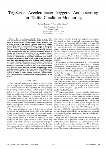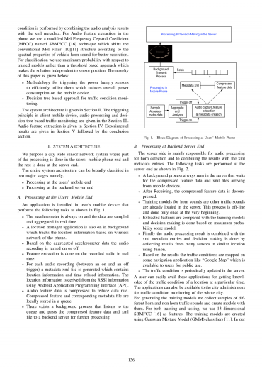 摘要----鸣笛率与平均车辆运动相结合可以粗略估计发展中国家城市街道的交通状况。最近,(许多研究)使用用户的移动电话进行了很多关于参与式感知的工作。这导致了对移动电话中的电池使用的担忧。在本文中,我们提出了一种用于触发传感的多模式方法,其中低功率传感器用于触发耗电量大的传感器以进行交通状况估计。低功耗传感器(如加速度计)不是打开所有传感器,而是通过应用预定义逻辑来触发高功耗传感器,如麦克风。音频的特征提取在移动设备上完成。包含位置相关信息和时间戳的特征数据和同时生成的元数据xml文件被发布到后端服务器以供进一步处理。提出了一种基于决策树的方法,通过使用喇叭检测来导出(获得)交通状况。根据这些决定,创建和更新交通状况监测申请以供公众访问。实验结果显示了触发音频感应在移动设备上的节能(高达50%)以及减少服务器整体处理方面的有效性。