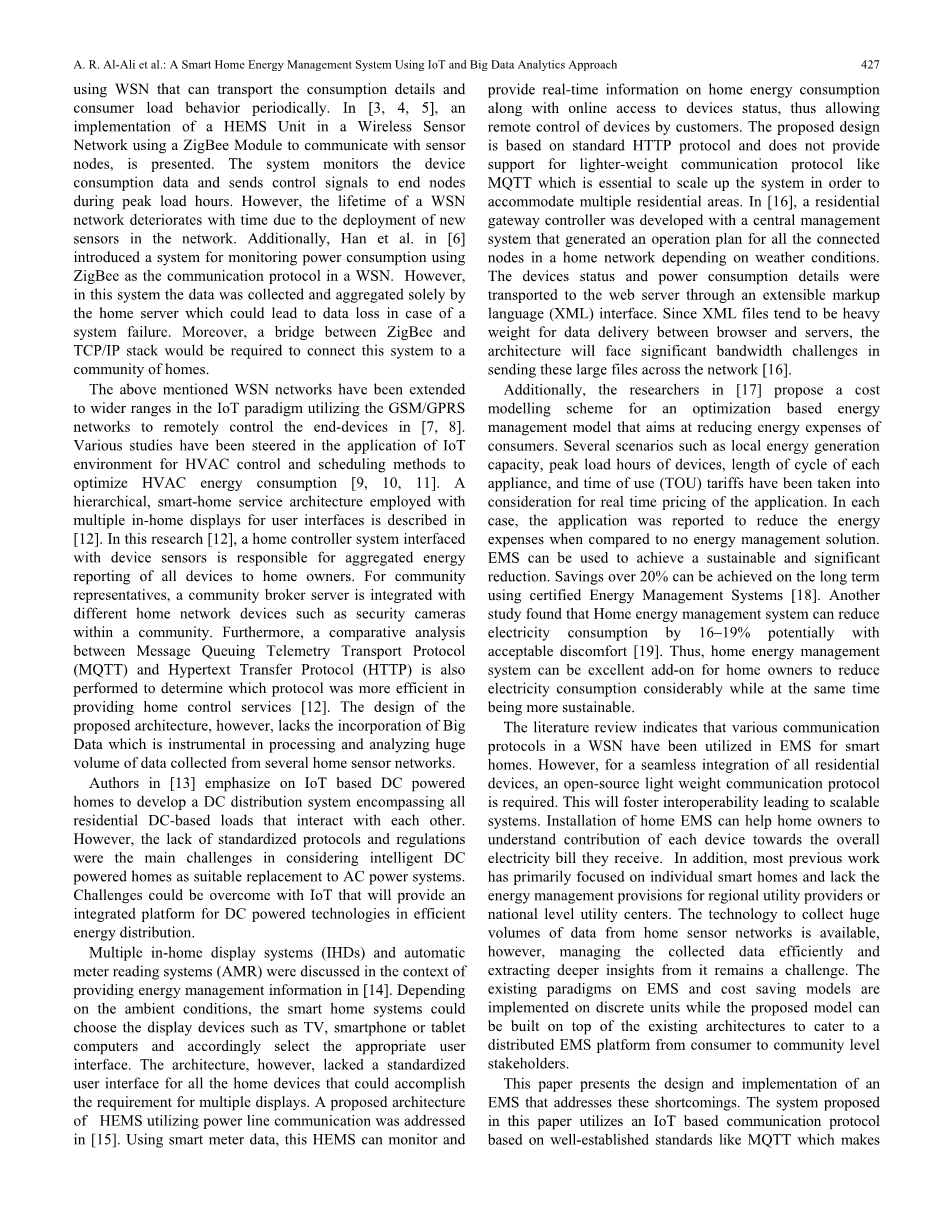 文献综述表明,无线传感器网络中的各种通信协议已经被用于智能住宅的EMS中。然而,为了实现所有住宅设备的无缝集成,需要一个开源的轻量级通信协议。这将促进可拓展系统的互操作性。安装家庭EMS可以帮助业主了解每个设备对他们收到的总电费的贡献。此外,大多数以前的工作主要集中在单个智能住宅上,缺乏地区公用事业供应商或国家一级公用事业中心的能源管理规定。从家庭传感器网络收集大量数据的技术是可行的,但是,有效地管理收集到的数据并从中提取更深刻的见解仍然是一个挑战。现有的EMS范式和成本节约模型是在离散单元上实现的,而提出的模型可以构建在现有体系结构之上,以满足从消费者到社区涉众的分布式EMS平台。