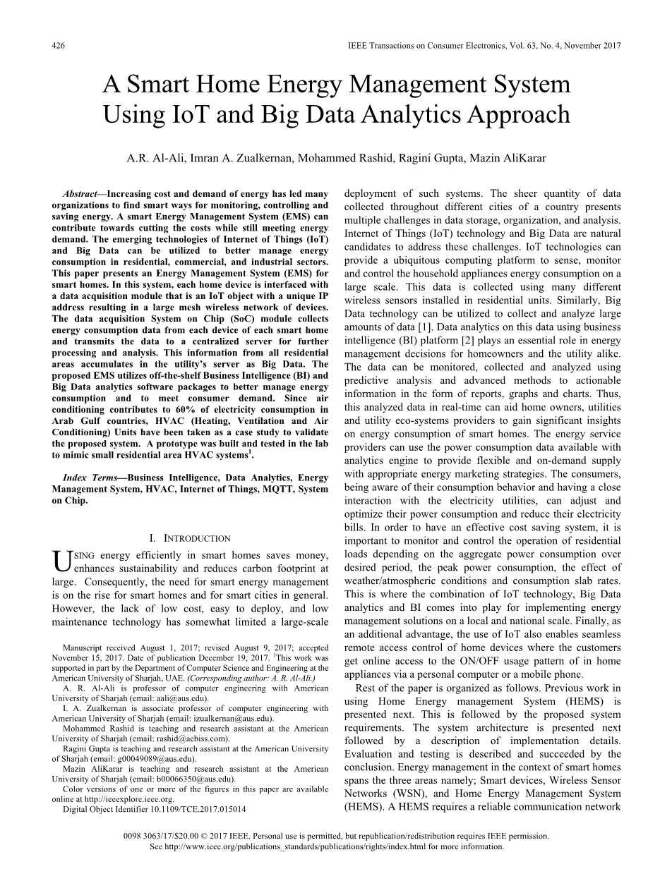 摘要 不断增长的成本和能源需求让很多组织找到了智能的方法来监测,控制和节约能源。智能能量管理系统(EMS)可有助于降低成本,同时仍满足能量需求。互联网上的新兴技术和大数据可以用来更好地管理住宅,商业和工业领域的能源消耗。本文介绍了一种智能家居能源管理系统(EMS)。在这个系统中,每个家庭设备都与一个数据采集模块进行交互,该模块是一个具有唯一IP地址的物联网对象,从而产生一个大的网格无线网络设备。芯片上的数据采集系统(SoC)模块收集每个智能家居设备的能耗数据,并将数据传输到中央服务器进行进一步的处理和分析。这些来自所有居民区的信息都以大数据的形式存储在公用事业的服务器中。拟议中的EMS利用现成的商业智能(BI)和大数据分析软件包,以更好地管理能源消耗并满足消费者需求。由于空调在阿拉伯海湾国家的电力消耗中所占的比重达到了60%,因此以暖通空调机组为例在实验室中建造并测试了一个原型,以模拟小型住宅区域HVAC系统验证该系统的可行性。