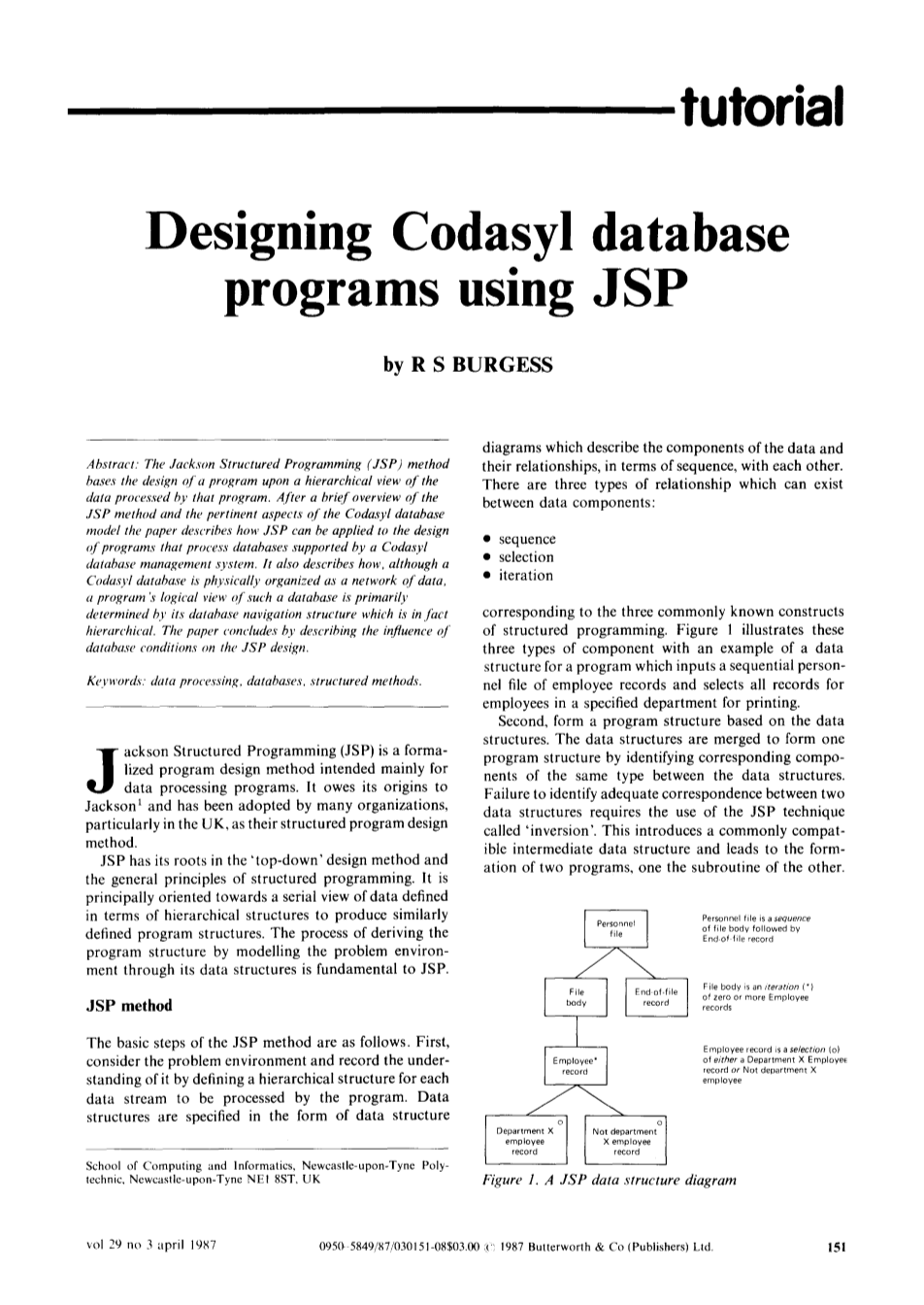 [3] Burgess, R S An Introduction to Program Design using JSP Hutchinson amp; Co. London, UK (1984)
