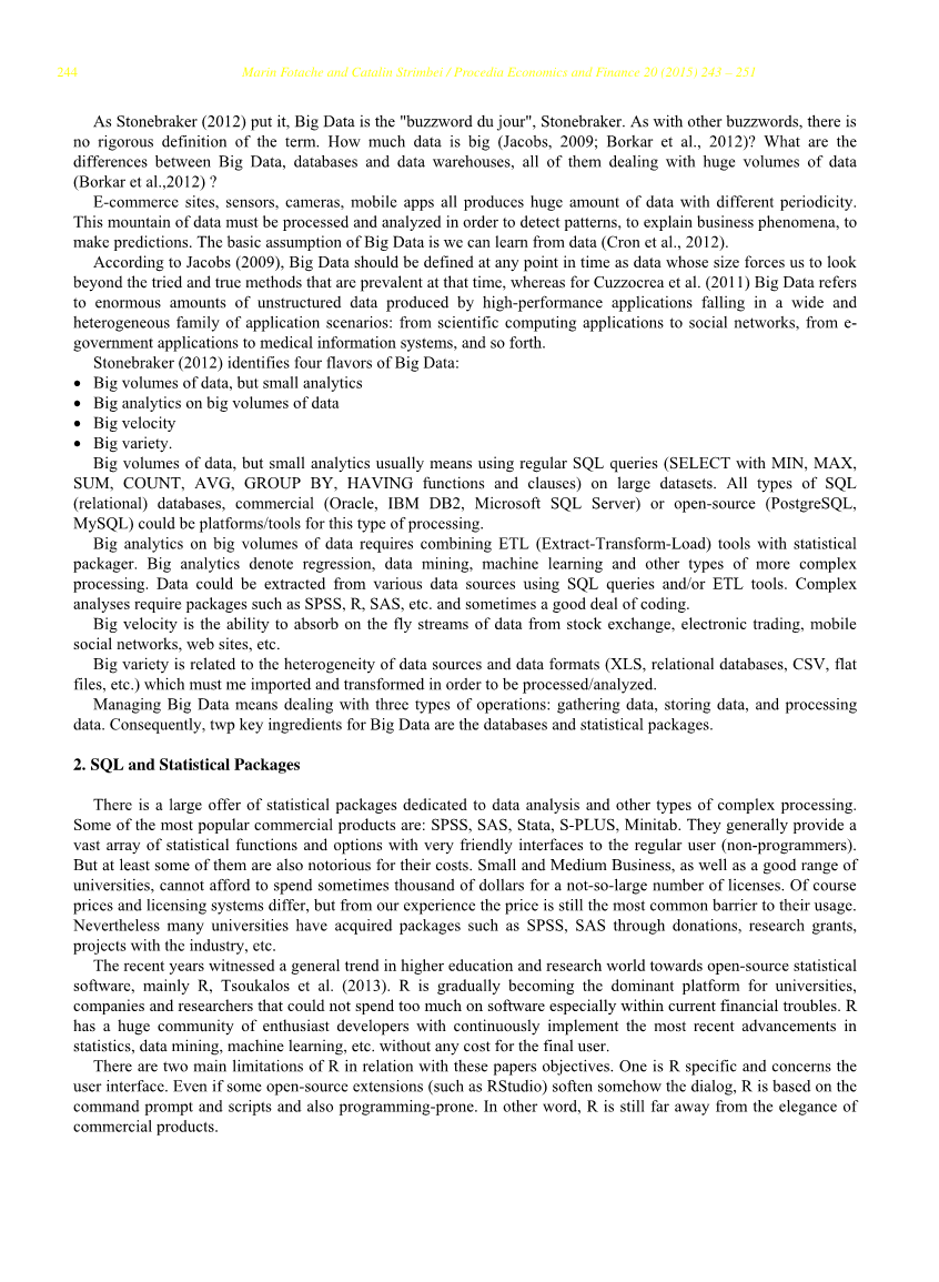 管理大数据意味着处理三种类型的操作:收集数据,存储数据和处理数据。 因此,大数据的两个关键要素是数据库和统计软件包。