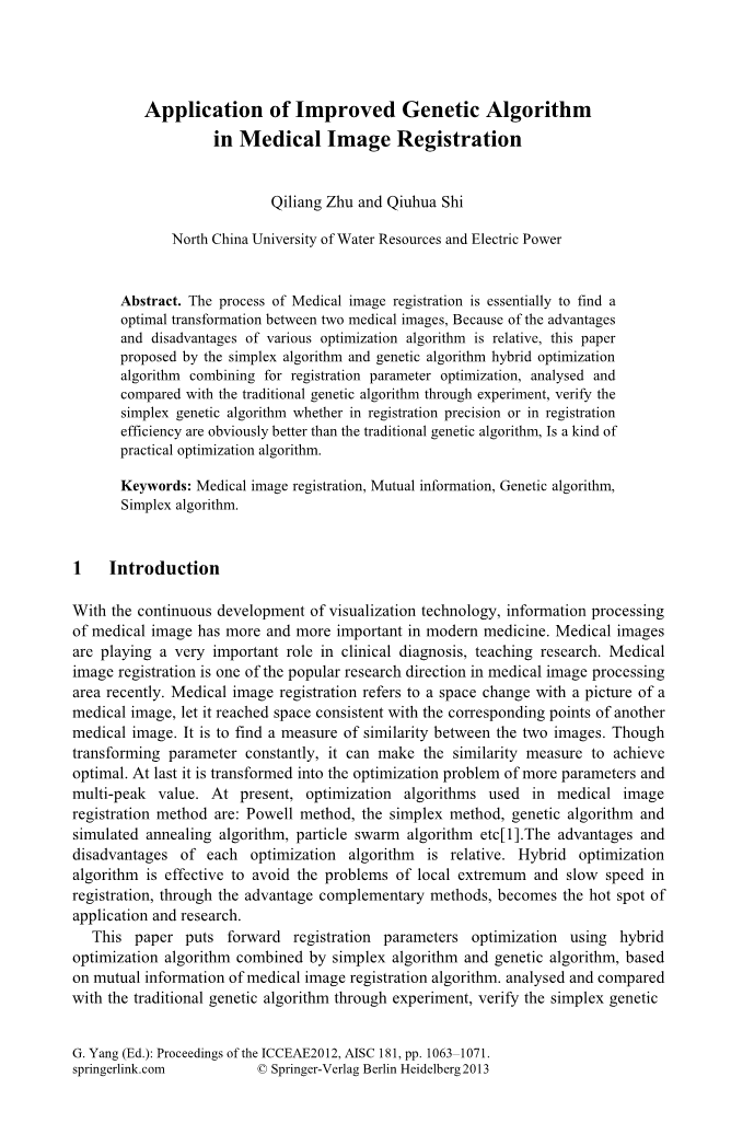 随着可视化技术的不断发展,医学图像的信息处理在现代医学中的地位越来越重要。医学图像在临床诊断、教学研究中起着非常重要的作用。医学图像配准是近年来医学图像处理领域的热门研究方向之一。医学图像配准是指利用医学图像的图像进行空间变化,使其达到与另一医学图像的对应点一致的空间。这是为了找到两个图像之间的相似性度量。通过对参数的不断变换,可以使相似性度量达到最优。最后将其转化为多参数、多峰值的优化问题。目前医学图像配准方法的优化算法有:鲍威尔法、单纯形法、遗传算法和模拟退火算法、粒子群算法等,各优化算法的优缺点是相对的。混合优化算法有效地避免了配准中局部极值和速度慢的问题,通过优势互补的方法,成为应用和研究的热点。在医学图像配准算法互信息的基础上,提出了基于单纯形算法和遗传算法相结合的混合优化算法配准参数优化。通过实验与传统遗传算法进行了分析比较,验证了单纯形遗传算法是一种实用的优化算法。无论是在配准精度上还是在配准效率上均明显优于传统遗传算法。