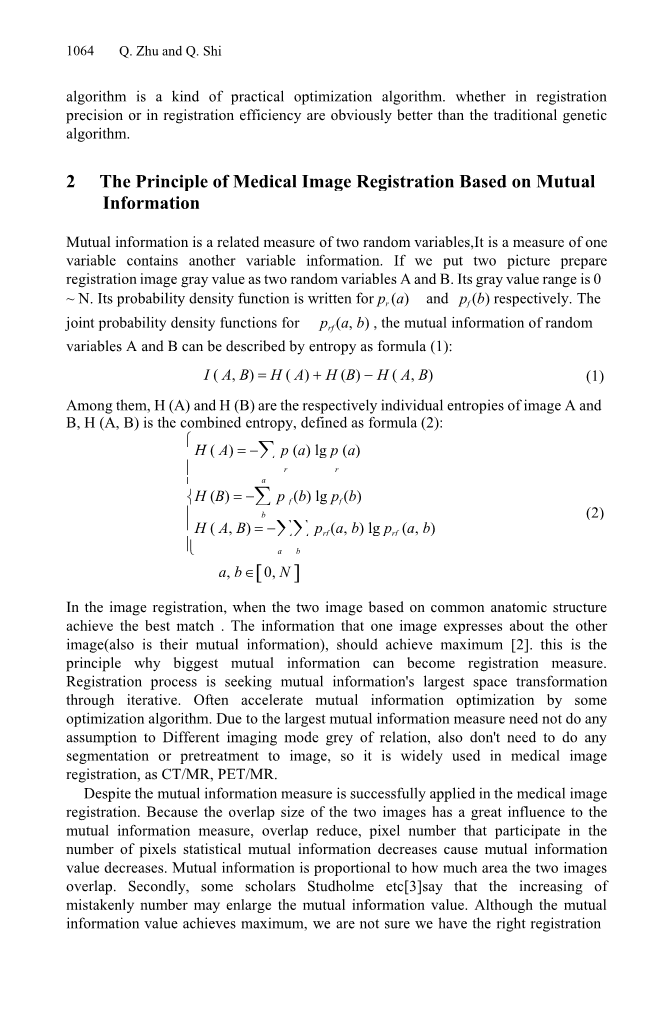 互信息是医学图像配准的重要手段。通过浮动图像几何变换,可以找到与浮动图像具有最大互信息的几何变换参数。因此,在互信息的医学图像配准中,适应度函数可以被识别为互信息计算函数,以几何变换参数为主要参数。