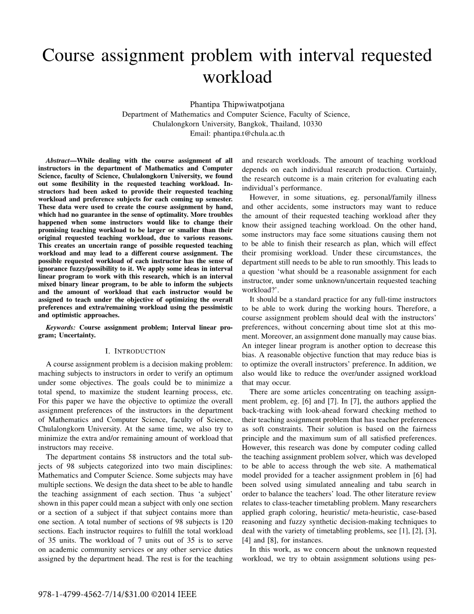 该系共有58名教师,98个科目共分为两个主要学科:数学和计算机科学。有些主题可能有多个部分。我们设计数据表以便能够处理每个部分的教学任务。因此,本文中显示的“主题”可能意味着一个主题只包含一个部分或一个主题部分,如果该主题包含多个部分。 98个科目共有120个部分。每位教练需要完成35个单位的总工作量。 35个中有7个单位的工作量是服务于学术界服务或由部门负责人指定的任何其他服务职责。其余部分用于教学978-1-4799-4562-7 / 14 / $ 31.00copy;2014 IEEE