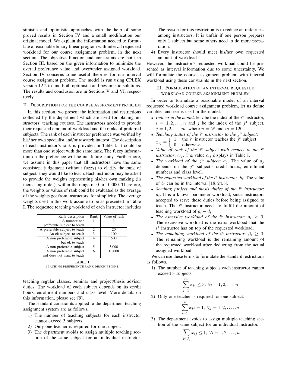 在这项工作中,当我们关注未知的工作量时,我们尝试使用悲观和乐观的方法获得工作分配解决方案,并借助第四节中的一些已证实的结果以及对原始模型的小修改。我们将在下一部分中解释制定合理的二进制线性程序所需的信息,该程序需要间隔请求的工作量来解决课程分配问题。第三部分根据给定的信息构建了目标函数和约束条件,以最大限度地减少总体偏好值以及超出/低于指定的工作量。第四节涉及我们的间隔课程分配问题的一些有用的理论。该模型使用CPLEX 12.2版运行,以找到乐观和悲观的解决方案。结果和结论分别在第五部分和第六部分。