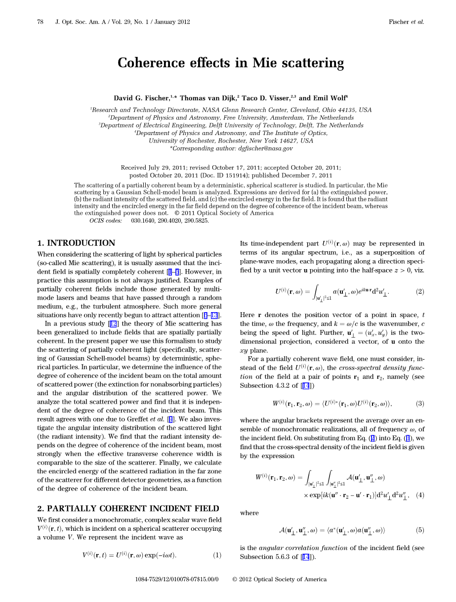 在之前的研究[12]中,米氏散射理论已经被推广到包含空间部分相干的场中。在本文中,我们使用这种形式来研究部分相干光(特别是高斯谢尔模型光束的散射)被确定性球形粒子的散射。特别是,我们确定了入射光束的相干程度对散射功率总量(非吸收粒子的消光)和散射功率的角度分布的影响。我们分析总的散射功率,发现它与入射光束的相干程度无关。这个结果与Greffet等人的结果一致[9]。我们还研究散射光的角度强度分布(辐射强度)。我们发现辐射强度取决于入射光束的相干程度,当有效横向相干宽度与散射体的大小相当时,辐射强度最强烈。最后,我们计算了不同几何形状探测器的散射体远区散射辐射的围束能,作为入射光束相干度的函数。