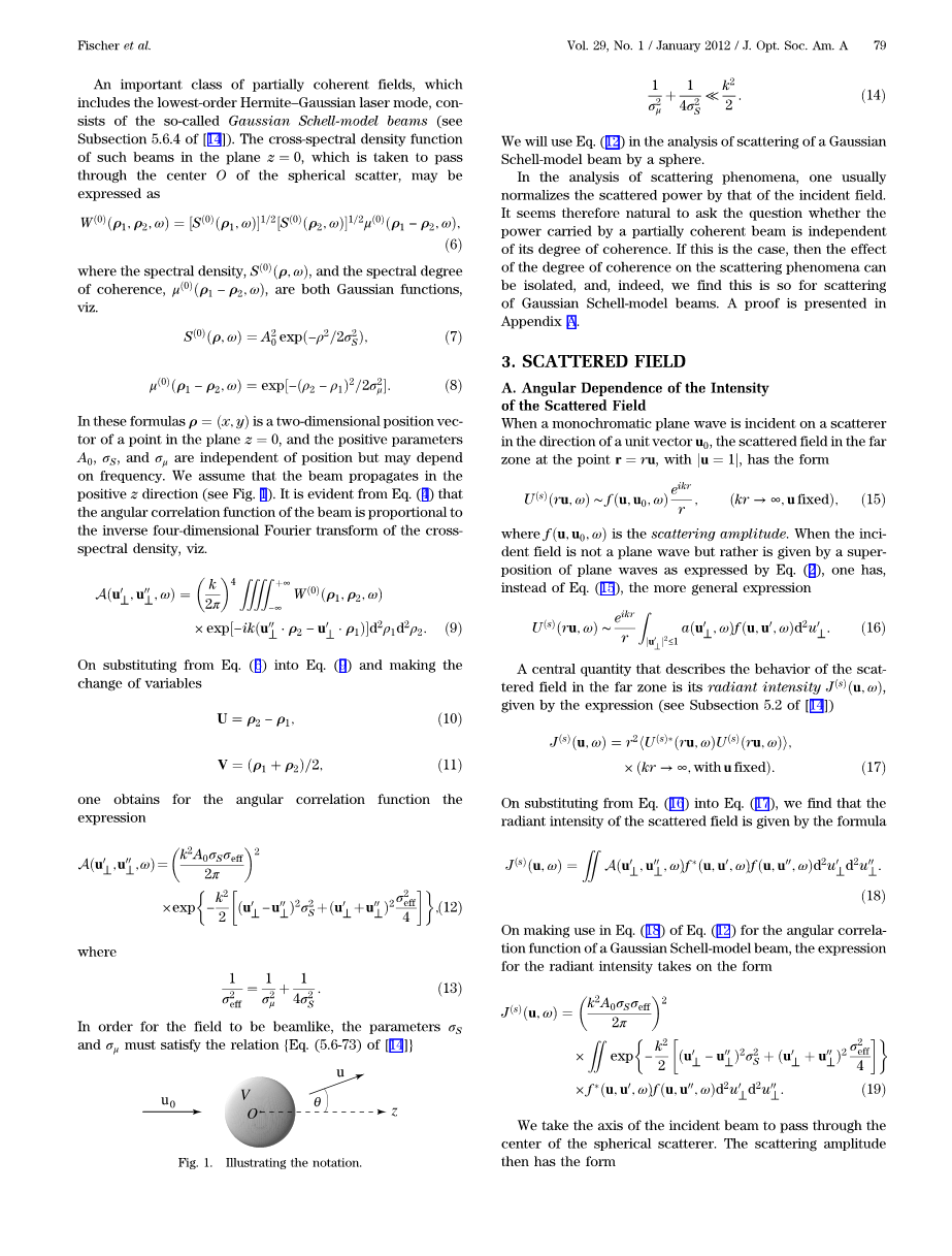 我们将在球形高斯谢尔模型光束的散射分析中使用方程(12)。