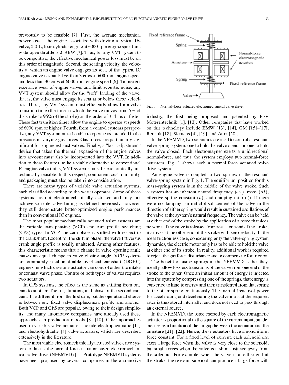 契合于发动机的瞬时操作。 实际上,VVT系统将取代目前camshaftdriven 气门驱动系统。为此,VVT系统必须与传统的气门驱动系统有一些相同的特征,同时让更多的灵活性,在1083-4435 / $ 20.00copy;2005 IEEE PARLIKAR:设计和电磁发动机的实验性实施阀驱动483 之前是可行的[7]中有所提到。首先,普通机械在一个典型的16相关2.0-l,四缸驱动发动机在6000转的转速节气门全开功率损失2–3千瓦[ 7 ]。因此,对于任何想要有竞争力VVT系统,有效的机械功率损耗必须达到这个数量级。其次,落座速度,速度在该发动机气门要接合其阀座,典型IC的发动机气门小:在600-RPM的发动机速度小于3厘米/秒,并在6000 rpm的发动机小于30厘米/秒速度[6]。为了防止发动机气门的过度磨损并限制噪音,任何VVT系统应允许阀的“软”着陆; 即,阀必须在等于或低于这些速度的情况下接合阀座。第三,任何VVT系统必须有效地允许阀转变时间(从5%阀移动的行程的行程的95%的时间)达到3-4毫秒或更快的量级。这些快速的转换时间使发动机的运转速度达到6000转或更高。第四,从一个控制系统的角度看,任何VVT系统必须能够如预期的操作变化的气体力。气力作用特别显著,尤其是在发动机排气门。最后,“间隙调节” 装置,其需要考虑发动机气门的热膨胀,还必须结合到VVT。除了这些特征,要想成为一个可行的替代常规IC发动机气门,VVT系统必须在经济上和技术上是可行的。在这方面,部件成本,耐用性,和包装也必须加以考虑。