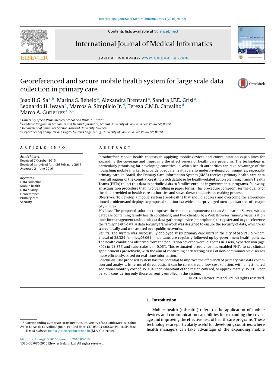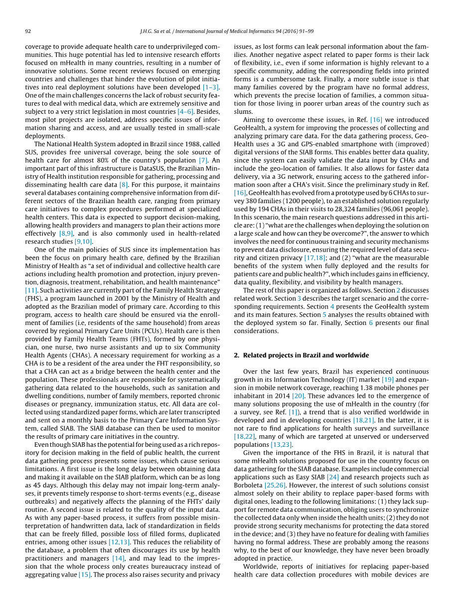 移动健康在于结合移动设备和通信能力,扩大覆盖范围和提高保健方案的有效性。该技术是发展中国家,在卫生部门可以充分利用蓬勃发展的移动市场为贫困社区提高保健服务,尤其是初级保健提供充分的医疗保健特别有前途。在巴西,基层医疗信息系统(SIAB)从全国各地区接受初级卫生保健数据,创造了与健康有关的丰富的行动计划数据库。家庭保健小组(FHTs)向参加政府计划的家庭定期访问要开发移动系统(GeoHealth)应该解决和克服问题,并部署在巴西主要城市的广泛贫困大都市区所提出的解决方案。