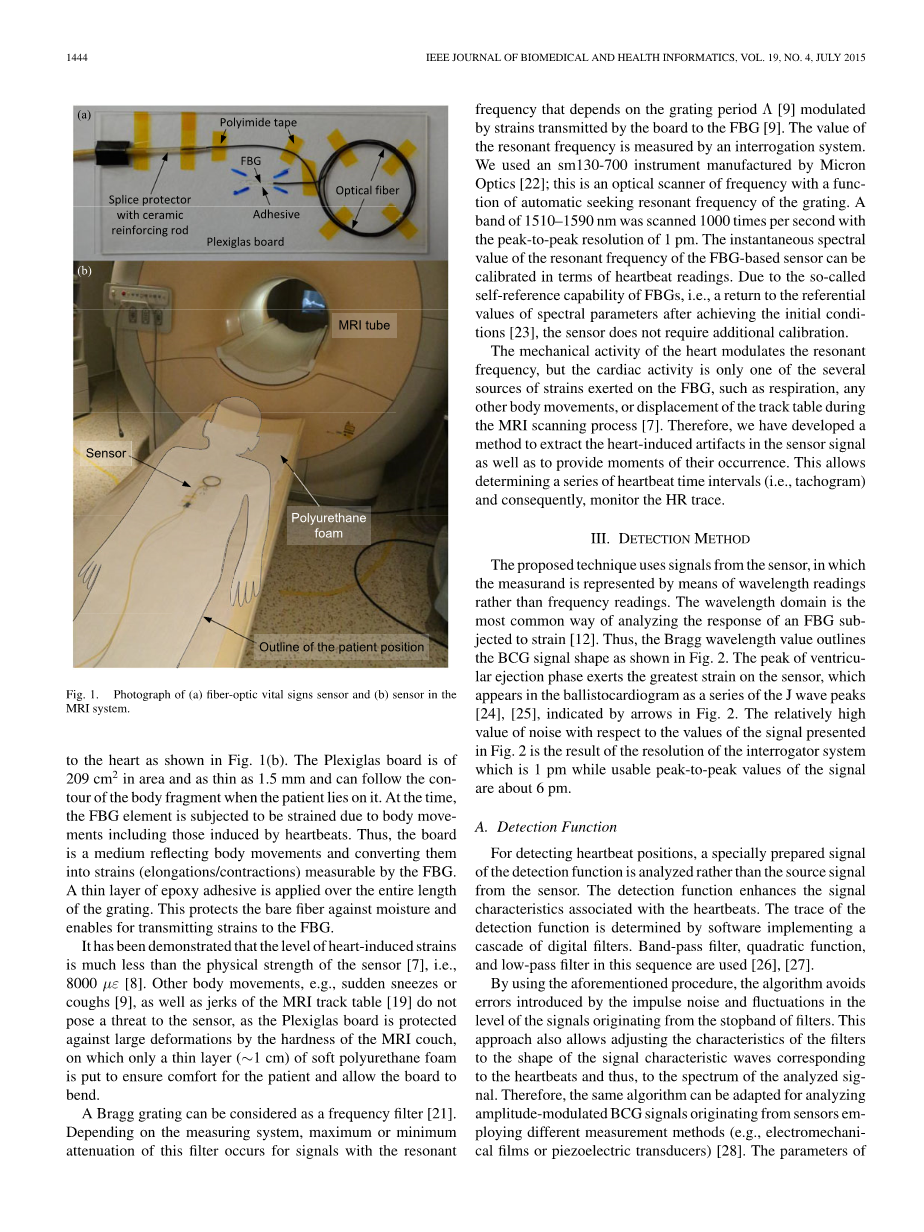 在MRI手术过程中,还有其他需要HR监测的患者类别,例如儿科患者,残疾患者,镇静或麻醉患者,危重患者或高危患者,对造影剂产生反应的患者以及所有无法进行治疗的患者或者可能无法传达或使用报警按钮。与电子换能器相反,光纤传感器不受MRI中使用的电磁场的影响,对患者安全,并且不影响成像质量。这些优点以及光纤传感器检测微小偏转(例如由心脏引起的身体运动导致的那些偏差)的能力再现了对记录心冲击信号的能力,特别是在MRI期间患者监测的情况下检查。