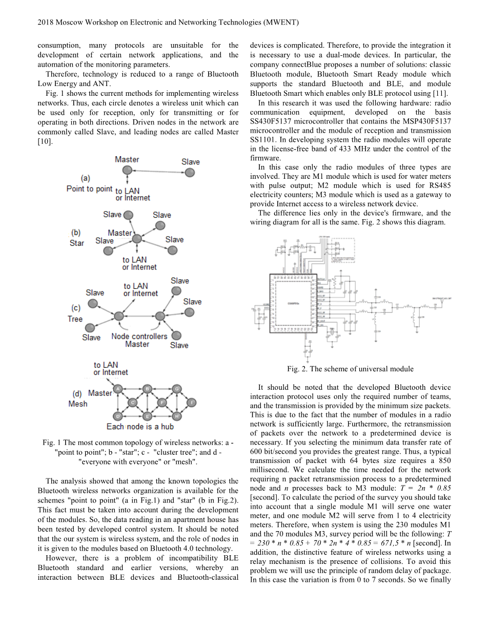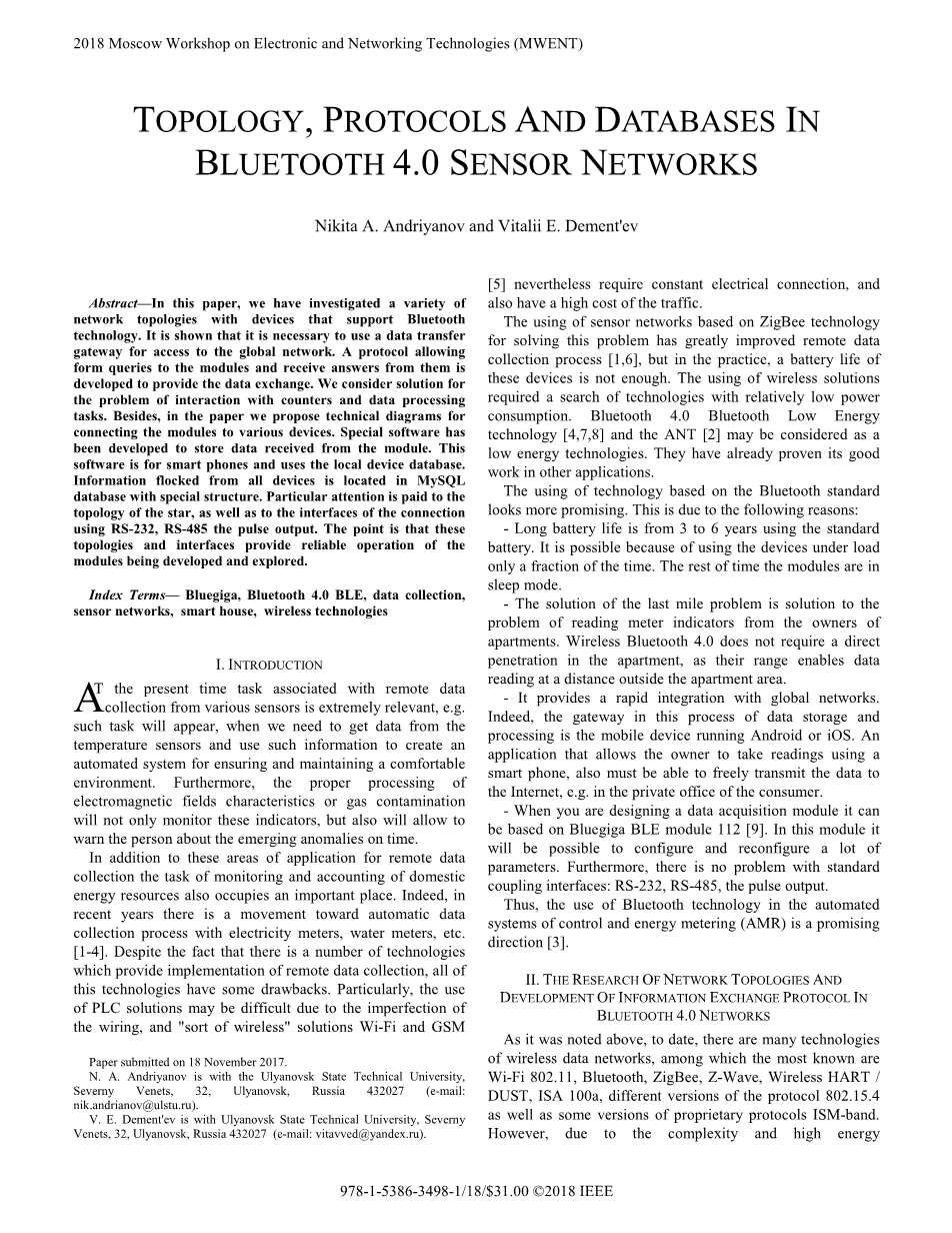 摘要 - 在本文中,我们已经研究了多种支持蓝牙技术的设备的网络拓扑结构。 结果表明,有必要使用数据传输网关访问全球网络。 为了提供数据交换,开发了允许对模块进行查询并从中接收答案的协议。 我们考虑与计数器和数据处理任务交互的问题的解决方案。 此外,在本文中,我们提出了将模块连接到各种设备的技术图。 已经开发了特殊软件来存储从模块收到的数据。 该软件适用于智能手机并使用本地设备数据库。 来自所有设备的信息位于具有特殊结构的MySQL数据库中。 特别注意星形的拓扑结构,以及连接接口使用RS-232,RS-485的脉冲输出。 重点是这些拓扑和接口为正在开发和探索的模块提供可靠的操作。