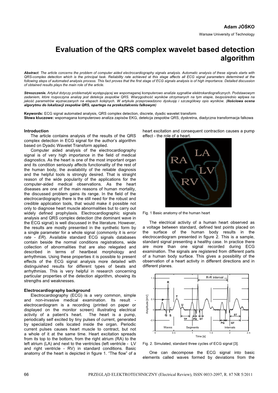 人们可以将ECG信号分解成基本元素,称为由偏差形成的波形。等电线(基线电压)。 它们被命名为:P Q R S T U。 P波反映右侧和下一个左心房的顺序激活(去极化)。 紧接着QRS波群是心室去极化的电子表示。 单周期ECG信号结束时有T波,表示心室复极化 - 恢复到静息状态。 心电图记录中可能会出现更多波形。 这是一个U波,但这一波的起源并不清楚, 在这里提及是考虑到了ECG信号的完整性。 除了波形之外,ECG信号还定义了分段和间隔。 前者是波浪之间的等电线,后者包括波浪和波浪。 它们都具有ECG分析和诊断过程中使用的重要参数集。 心电信号的自动分析对于心脏疾病监测和诊断过程来说是非常有用的,甚至常常是必需的。 QRS波形也是ECG循环中最重要的波形指令,自动分析从检测到这个波形开始。 精确检测QRS波群是非常重要的,因为它们的位置直接用于确定基本参数,如心率和心率变异性。 这些位置还用作自动心电图分析的以下阶段中的基准点,集中在P波和T波检测以及分段和间隔属性确定。 参数集包括波的幅度和极性,它们的持续时间以及段的持续时间间隔作为计算机辅助诊断程序的输入值。