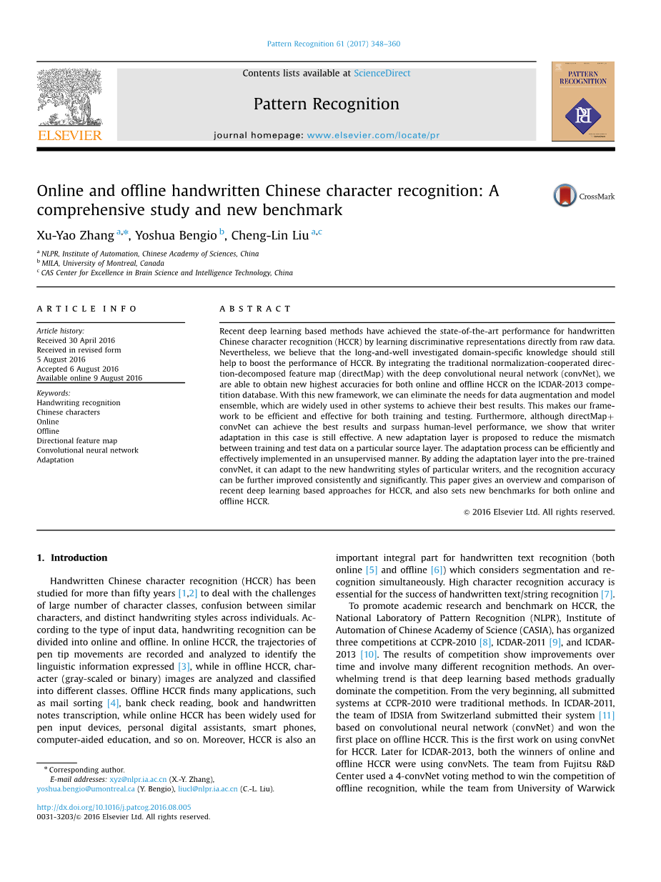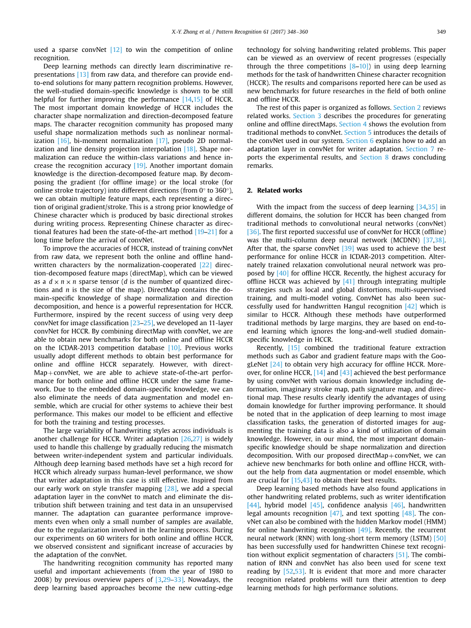 手写识别社区已经报告了以前的[3,29-33]综述文章中许多有用和重要的成果(从1980年到2008年)。如今,基于深度学习的方法成为解决手写相关问题的新型尖端技术。本文可以看作是对近期的研究进展(特别是通过三次竞赛[8-10])对使用深度学习方法进行手写汉字识别(HCCR)的任务。这里报告的结果和比较可以作为未来在线和流动HCCR领域研究的新基准。