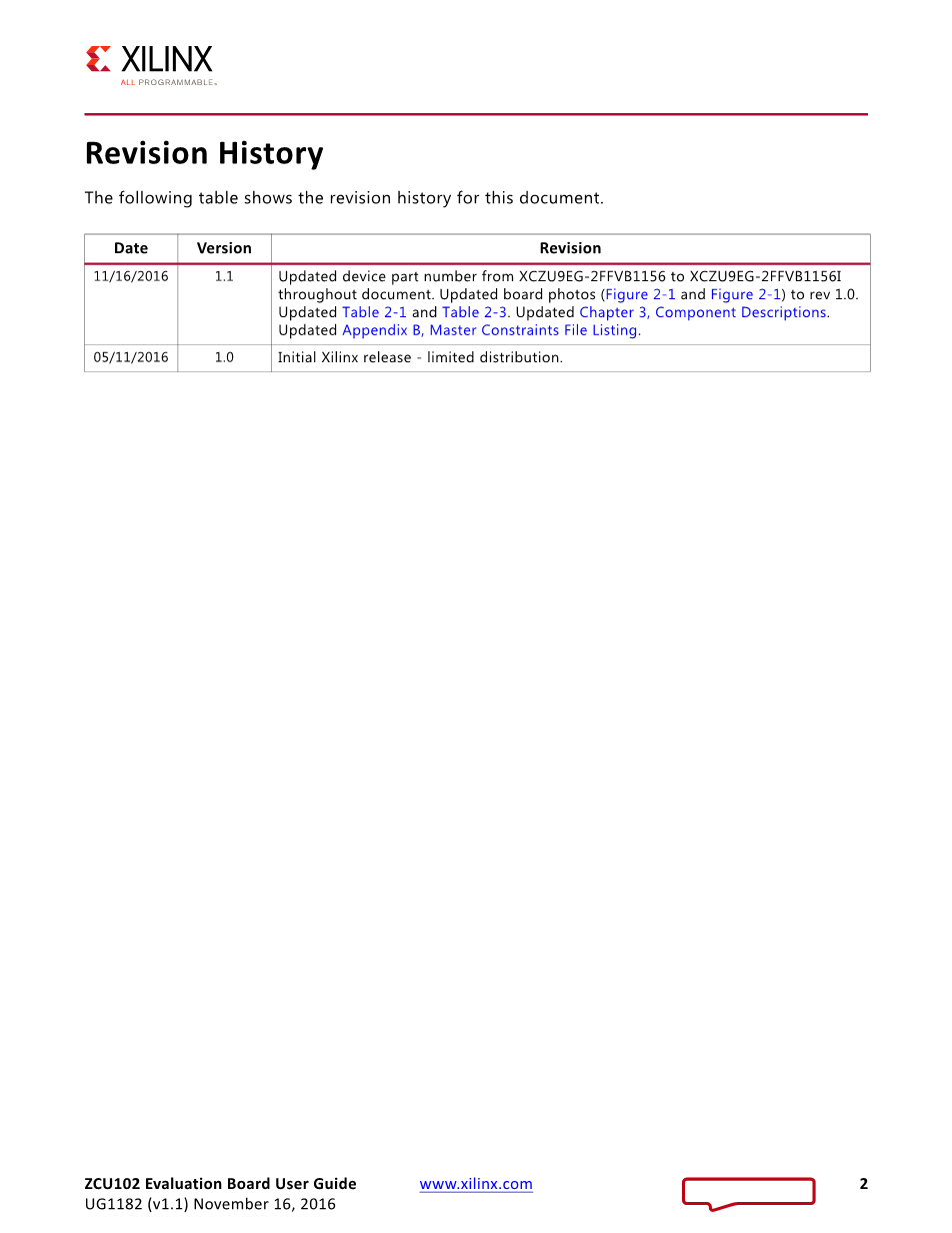 在文档中把设备部件号从XCZU9EG-2FFVB1156改成了 XCZU9EG-2FFVB1156I 更新板子图片 (Figure 2-1 和 Figure 2-1) 到了1.0版本. 更新 Table 2-1 和 Table 2-3. 更新 第三章, 组件描述. 更新 附录 B, 主约束文件列表 . |