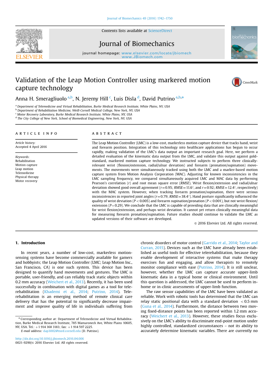LMC的原始传感器功能可靠性已经得到了验证。使用机器人工具可以证实LMC可以以lt;0.5mm的标准偏差捕获静态位置数据(Guna等,2014)。此外,两个移动固定距离点之间的距离已经被证实在1.2mm精度内(Weichertetal.,2013)。然而,这些研究只集中在LMC在高度受控的标准化环境下区分终点运动的能力,而不是准确地确定运动学变量的能力。目前还没有研究评估LMC在现实临床或家庭环境中准确跟踪人类受试者的手腕和前臂运动的能力。如果LMC可以在实际环境中提供精确的关节角度数据,则允许临床医生使用其远程执行上肢功能评估。对于对患有腕部和前臂运动功能障碍的个人的护理的改善所带来的影响是十分巨大的:临床医生不仅可以跟踪家庭锻炼计划的完成度,还可以以前所未有的准确性测量家庭锻炼对关节的影响。对家庭锻炼计划完成度以及对关节功能的改善程度的观察将使临床医生能够严格评估每位患者的家庭锻炼的疗效。