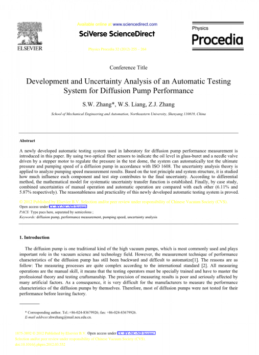 摘 要:在这篇论文中介绍了一种新研制的用在实验室的扩散泵性能自动测试系统。该系统利用两个光纤传感器来指示玻璃滴定管中的液位,并利用步进电机驱动的针阀来调节试验圆顶中的压力,该系统可以根据ISO 1608自动测试扩散泵的极限压力和泵速。应用不确定度分析理论对抽水速度测量结果进行分析。基于测试原理和系统结构,研究了各组成部分和测试步骤对最终不确定度的影响程度。根据微分法建立了系统不确定度传递函数的数学模型。最后,通过实例分析,比较了人工操作和自动操作的组合不确定性(分别为6.11%和5.87%)。证明了该自动测试系统的合理性和实用性。