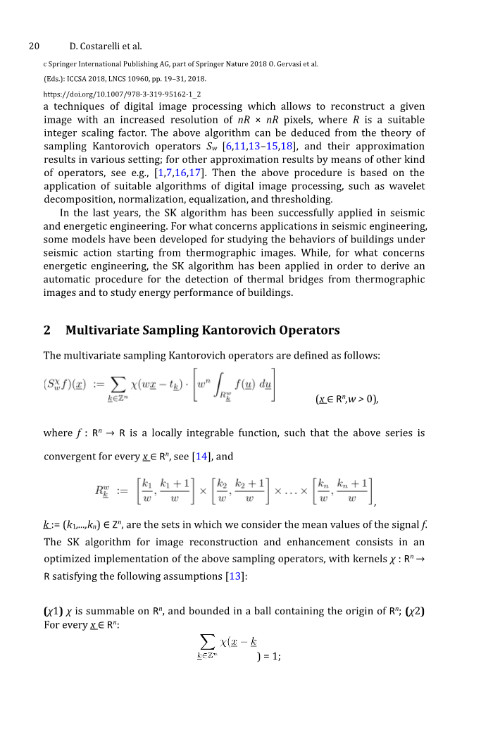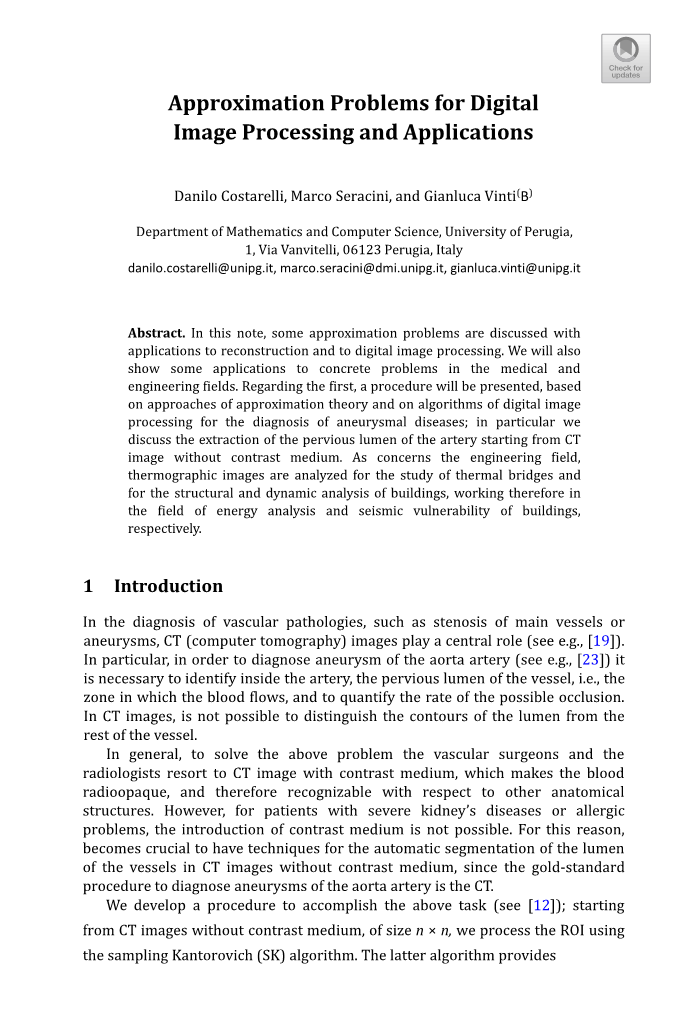 摘要. 本文讨论了一些近似问题及其在重建和数字图像处理中的应用。我们还将展示一些在医学和工程领域的具体问题的应用。关于第一个,将提出一个程序,基于近似理论的方法和数字图像处理的算法诊断动脉瘤疾病;特别地,我们讨论了从没有造影剂的CT图像开始提取动脉的可透过管腔。就工程领域而言,热成像图像被分析用于热桥研究和建筑物的结构和动态分析,因此分别在建筑物的能量分析和地震易损性领域工作。