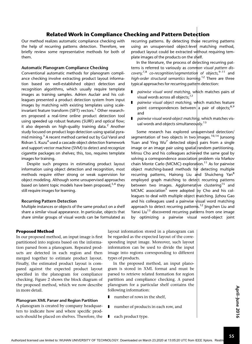 基于计算机视觉的技术已经被开发用于自动平面图一致性检查(参见侧栏)。该问题被认为是典型的目标检测问题,通过将货架输入图像与给定的产品模板图像进行匹配来检测和定位产品。然后通过将检测到的产品布局与预先指定的平面图进行比较来执行遵从性检查。但是,这种方法需要最新的产品模板映像,而这些映像通常是不可用的。此外,它还取决于图像的质量、光照条件、图像的视点以及由于供应商定期进行的季节性促销而导致的图像模式变化。